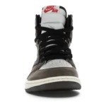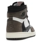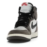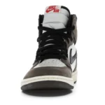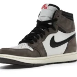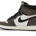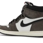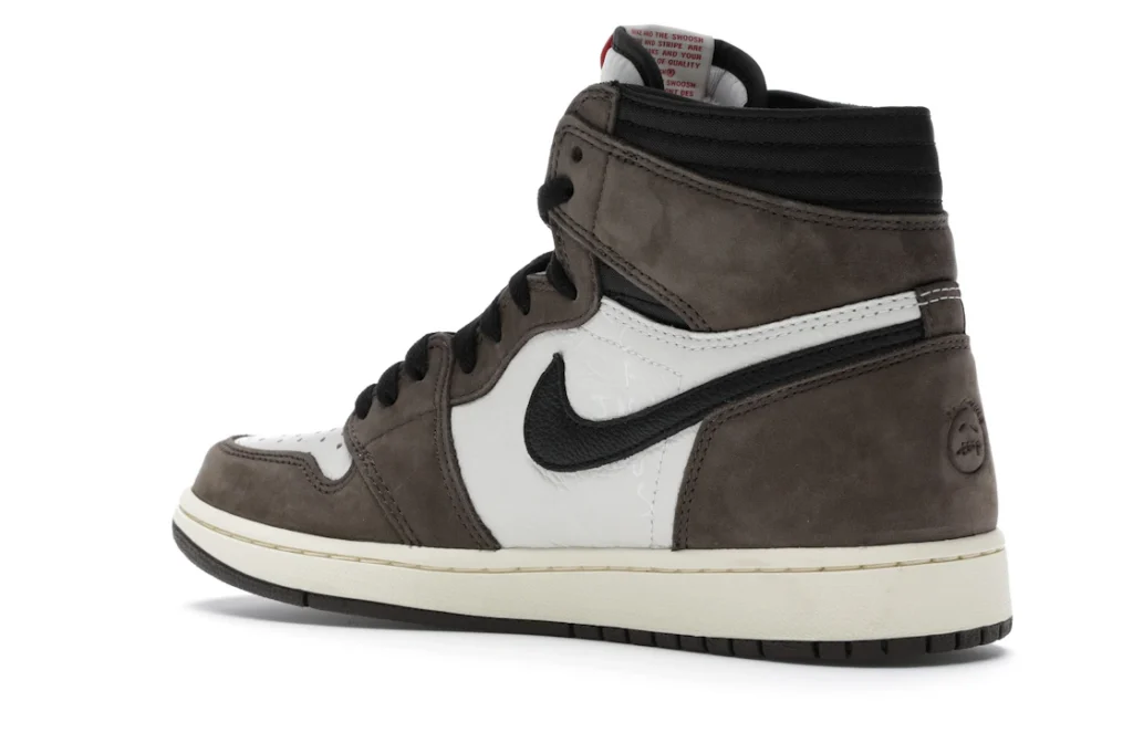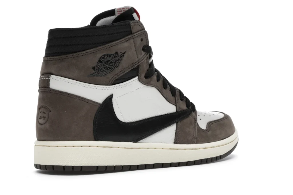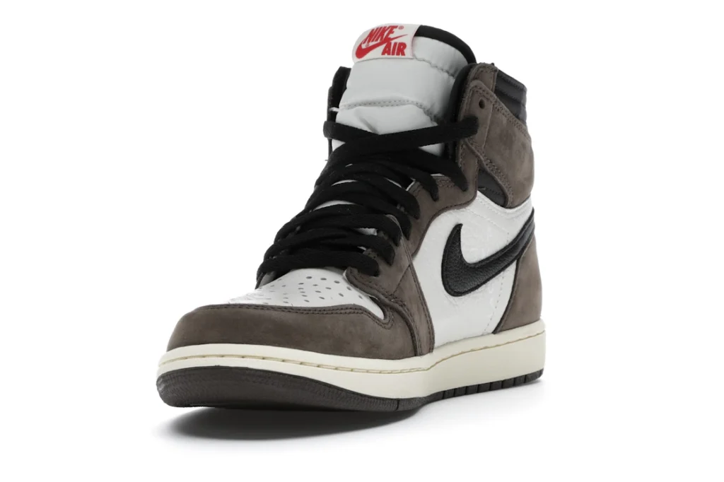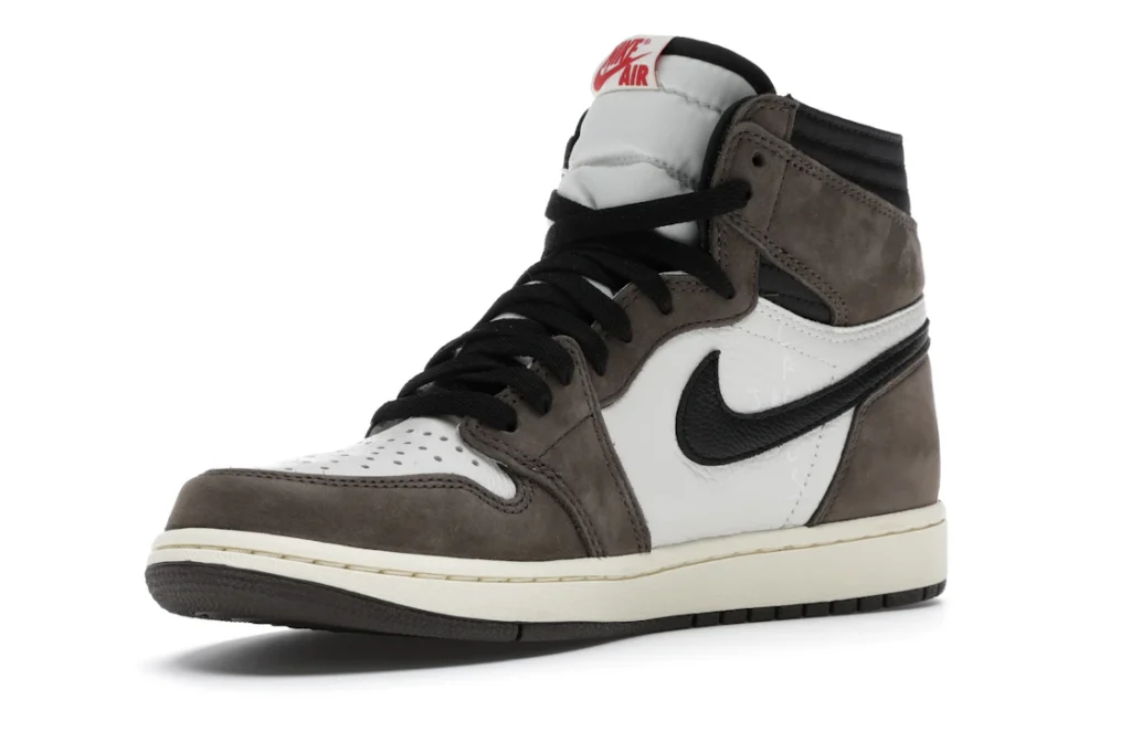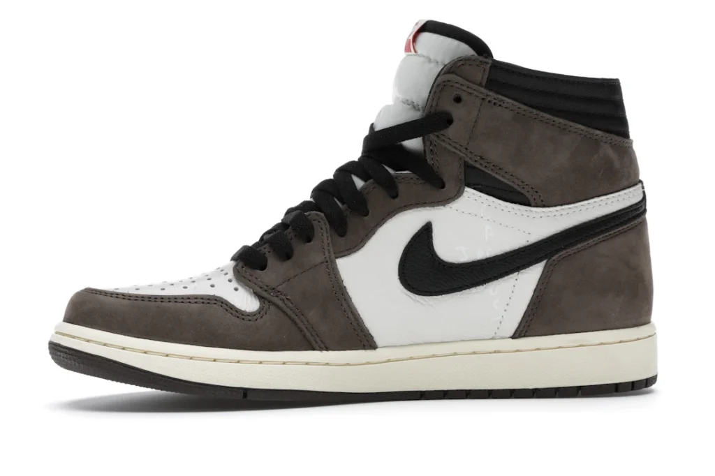The Air Jordan 1 Travis Scott features a white leather upper with Mocha suede overlays and black leather reversed Swooshes. Hits of red on the tongue slightly contrast the design’s earth tones. On the heel, a debossed Cactus Jack logo adds a custom feel. From there, a yellowed midsole and matching Mocha outsole complete the design.