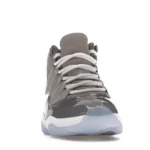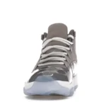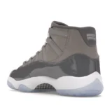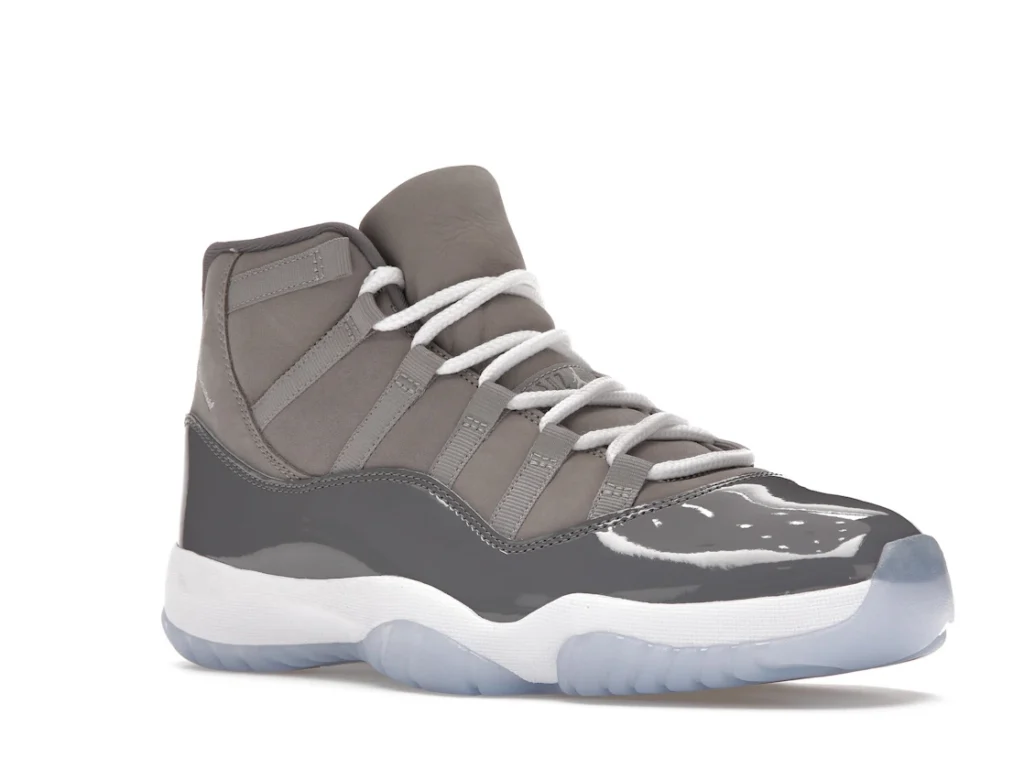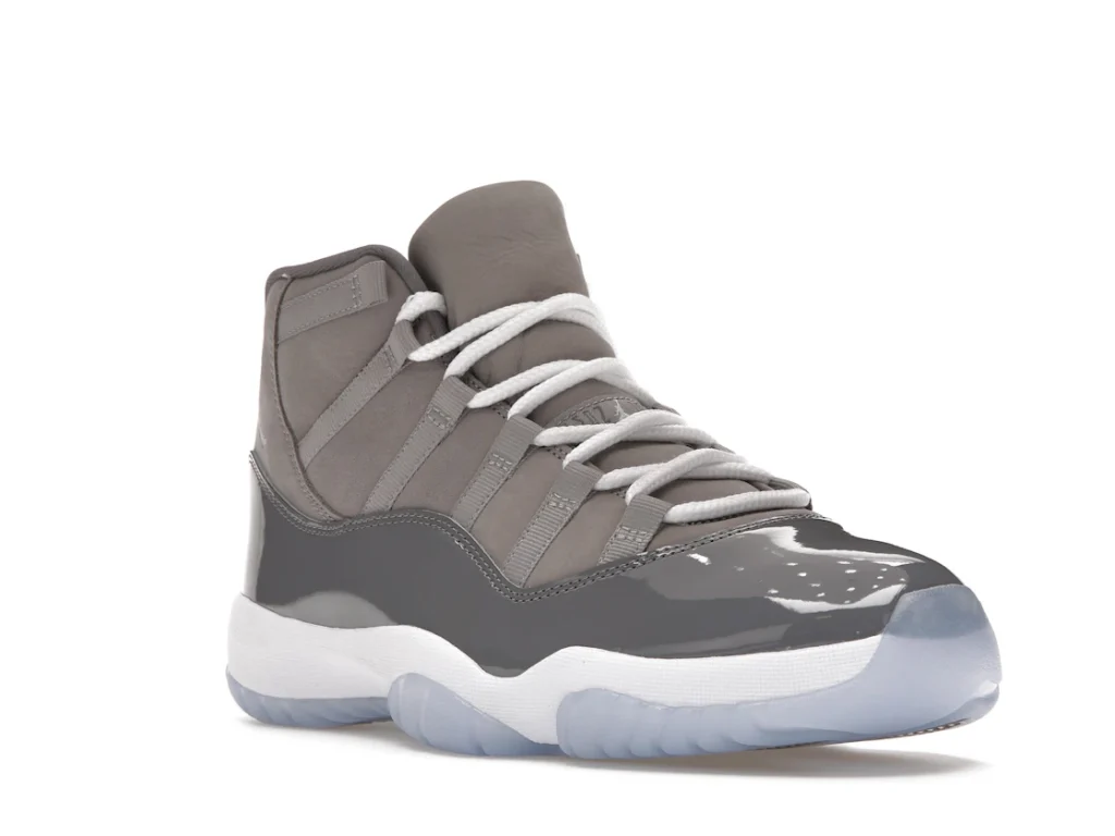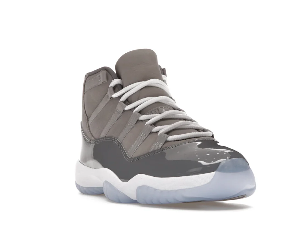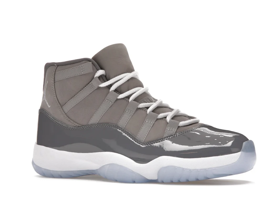 The Air Jordan 11 Cool Grey (2021) features a Cool Grey Durabuck upper with patent leather overlays and a signature Jumpman embroidery on the collar. From there, a white midsole and an icy blue translucent outsole complete the design.