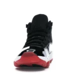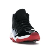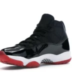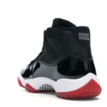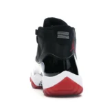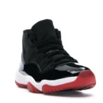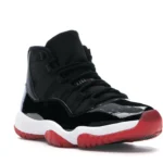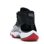 This Jordan 11 features a black upper with shiny patent leather overlays and red detailing. A red translucent outsole, white midsole, and “23” insignia on the heel completes the design. These sneakers released in November of 2019 and retailed for $220.