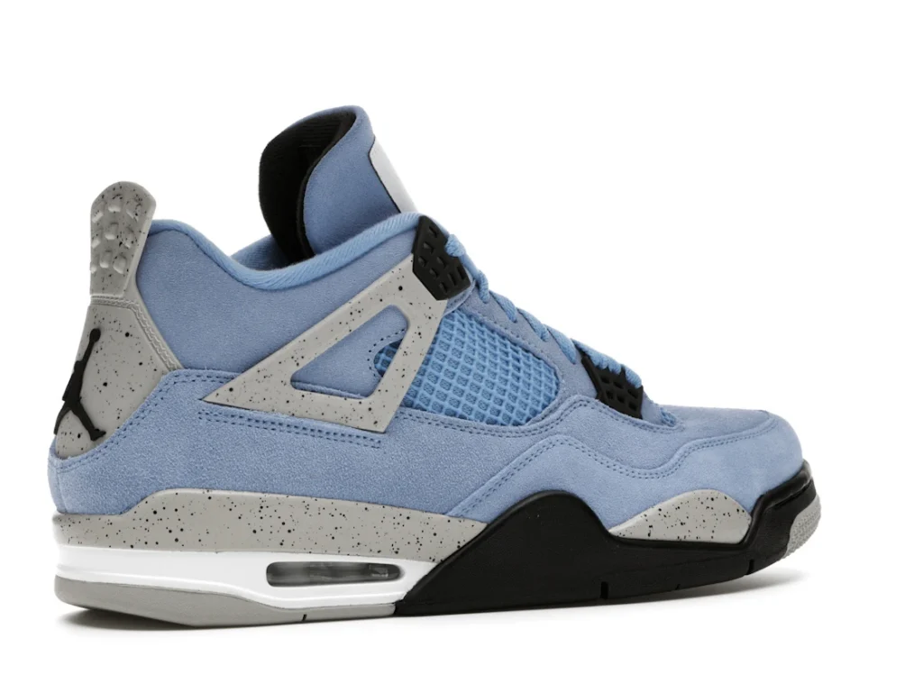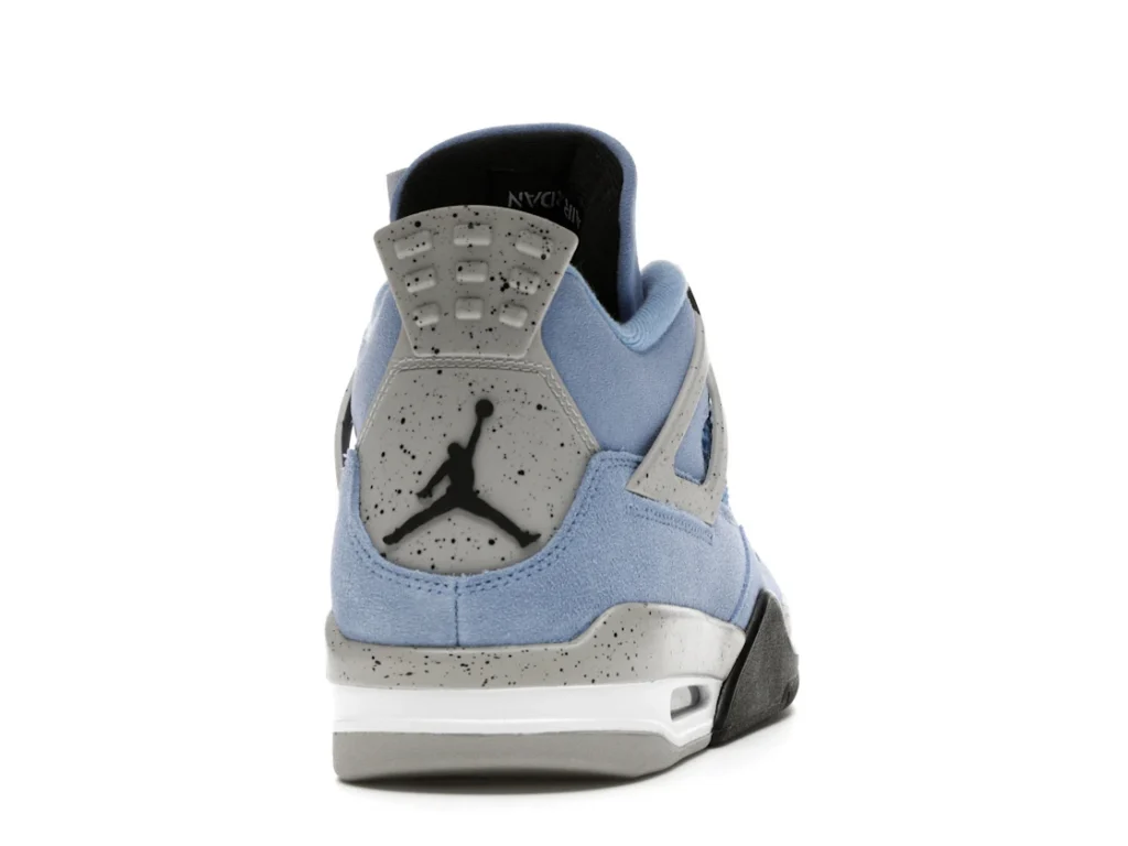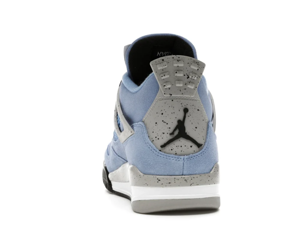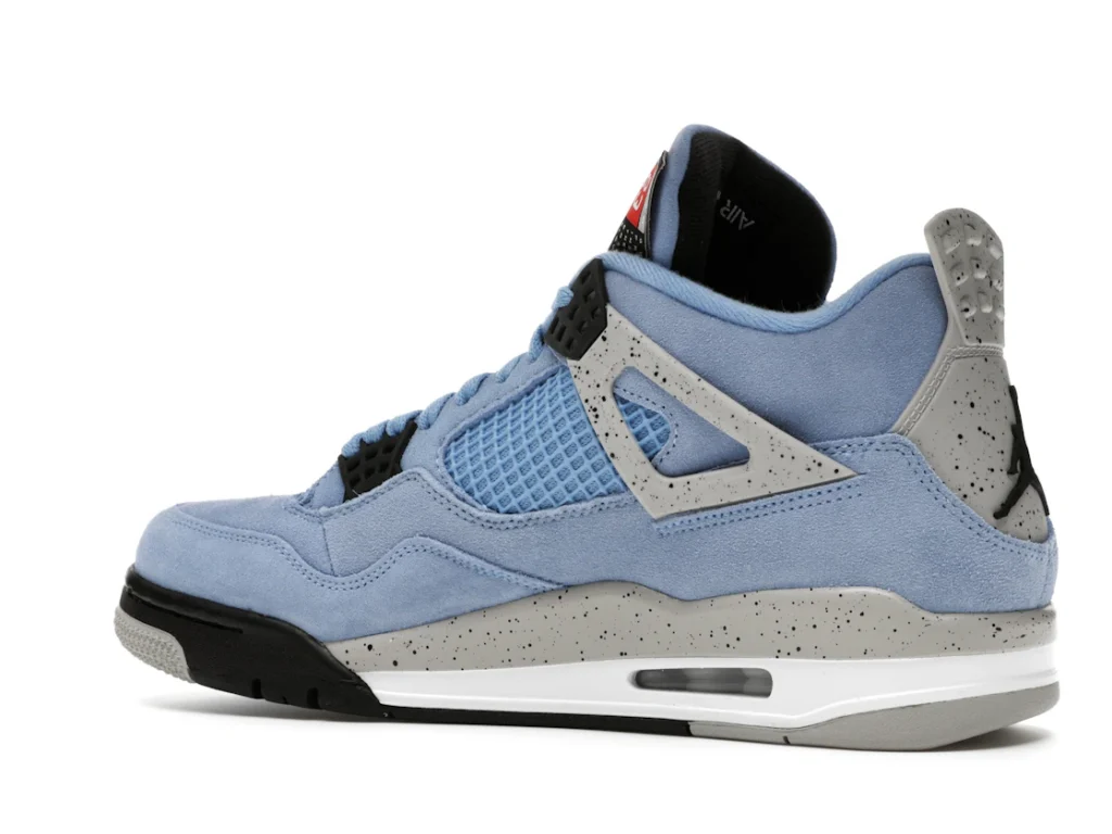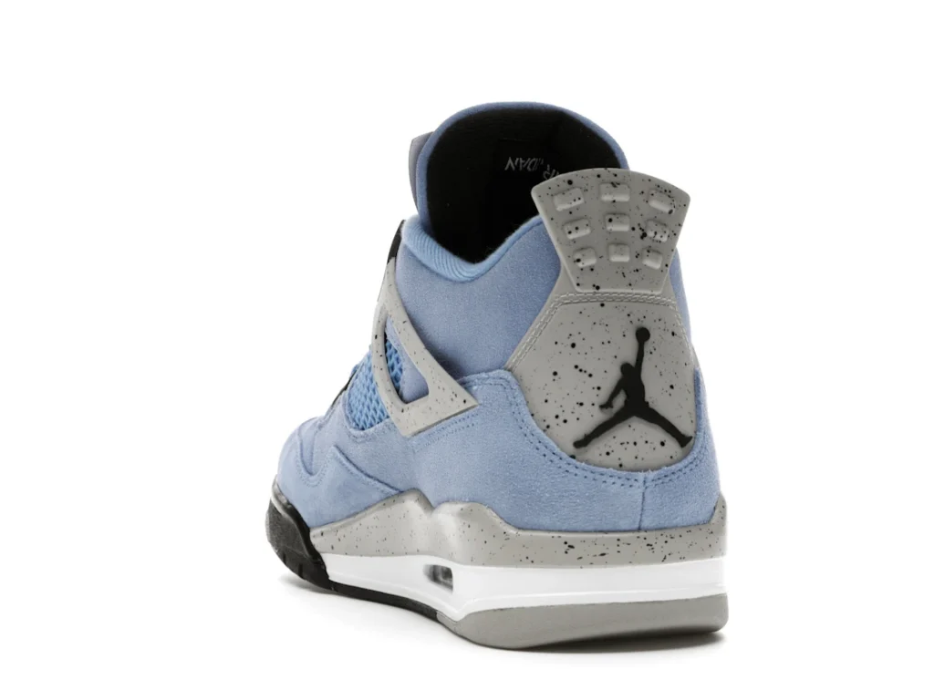 The Air Jordan 4 University Blue features a University Blue suede upper with mesh netting on the quarter panel and tongue. Similar to OG Jordan 4 colorways of the past, the eyelets, heel tab, and sections of the midsole are a speckled Cement Grey. Hits of black appear on the wing eyelets, sole, and Jumpman logo on the heel tab. Two woven labels are stitched to the tongue; one being the classic Jumpman woven label; the other being a Team Jordan jock tag. A black, white, and Tech Grey sole with a clear Air unit completes the design.