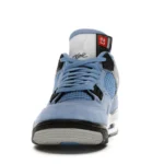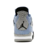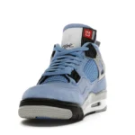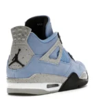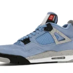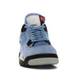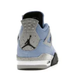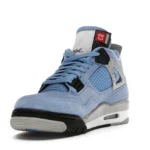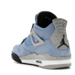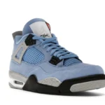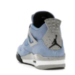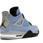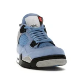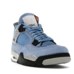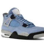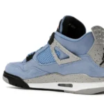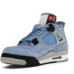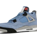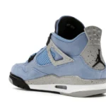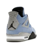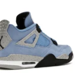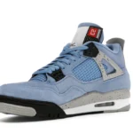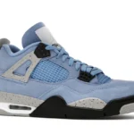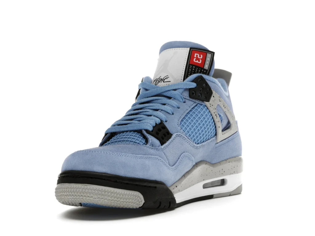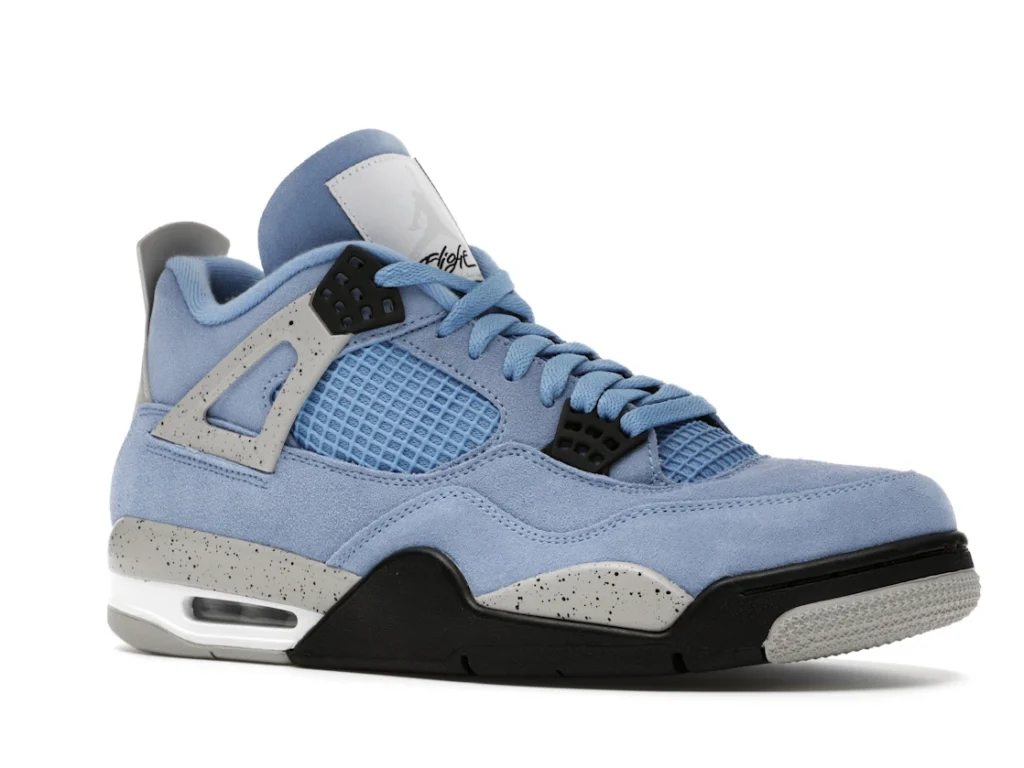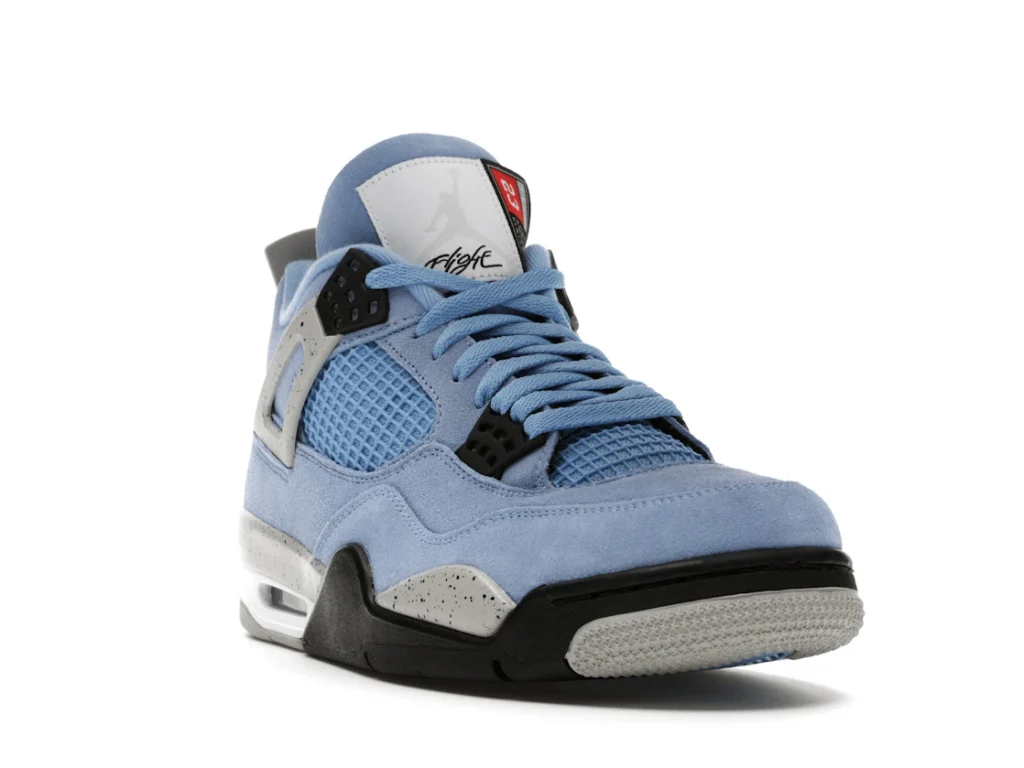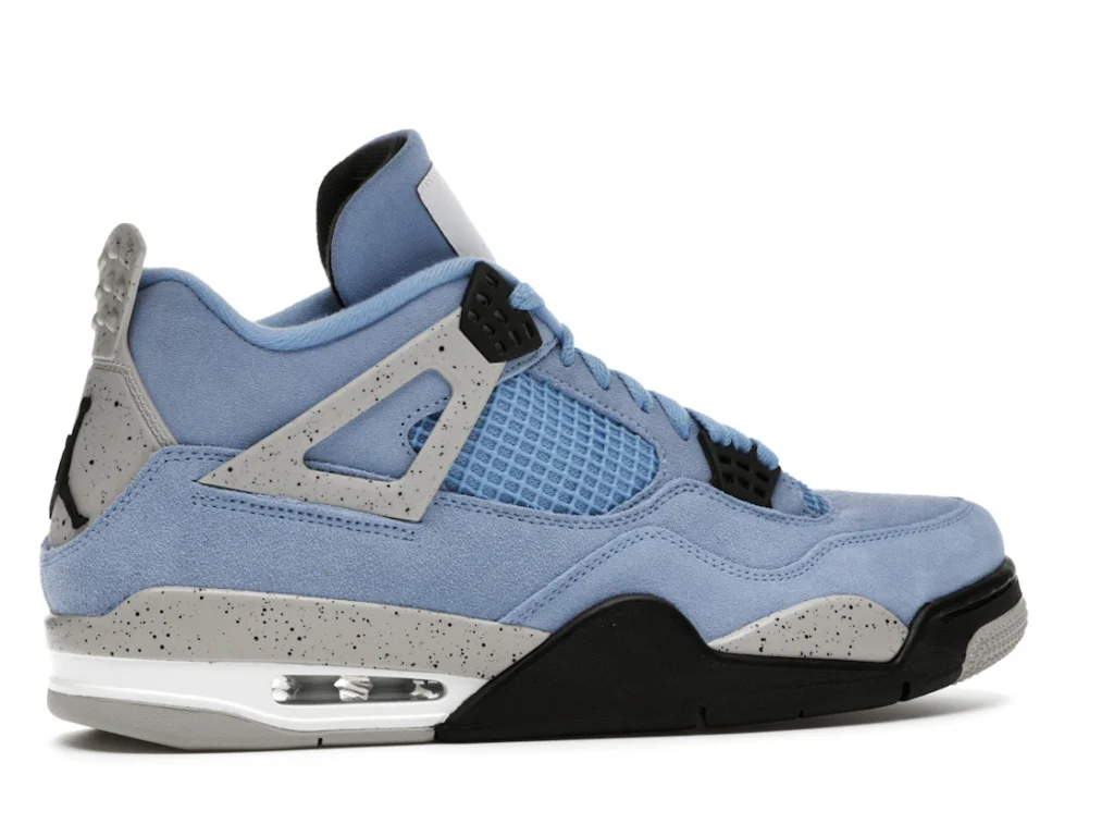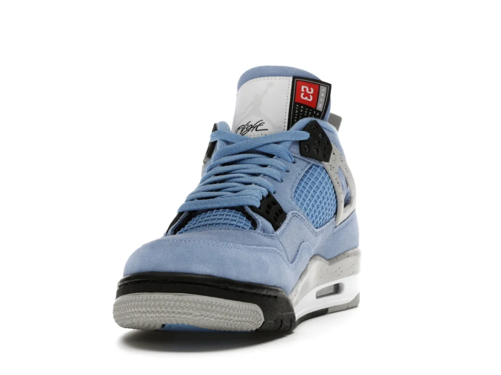 The Air Jordan 4 University Blue features a University Blue suede upper with mesh netting on the quarter panel and tongue. Similar to OG Jordan 4 colorways of the past, the eyelets, heel tab, and sections of the midsole are a speckled Cement Grey. Hits of black appear on the wing eyelets, sole, and Jumpman logo on the heel tab. Two woven labels are stitched to the tongue; one being the classic Jumpman woven label; the other being a Team Jordan jock tag. A black, white, and Tech Grey sole with a clear Air unit completes the design.