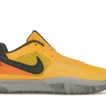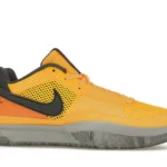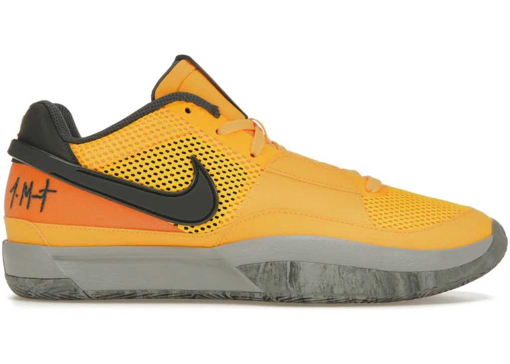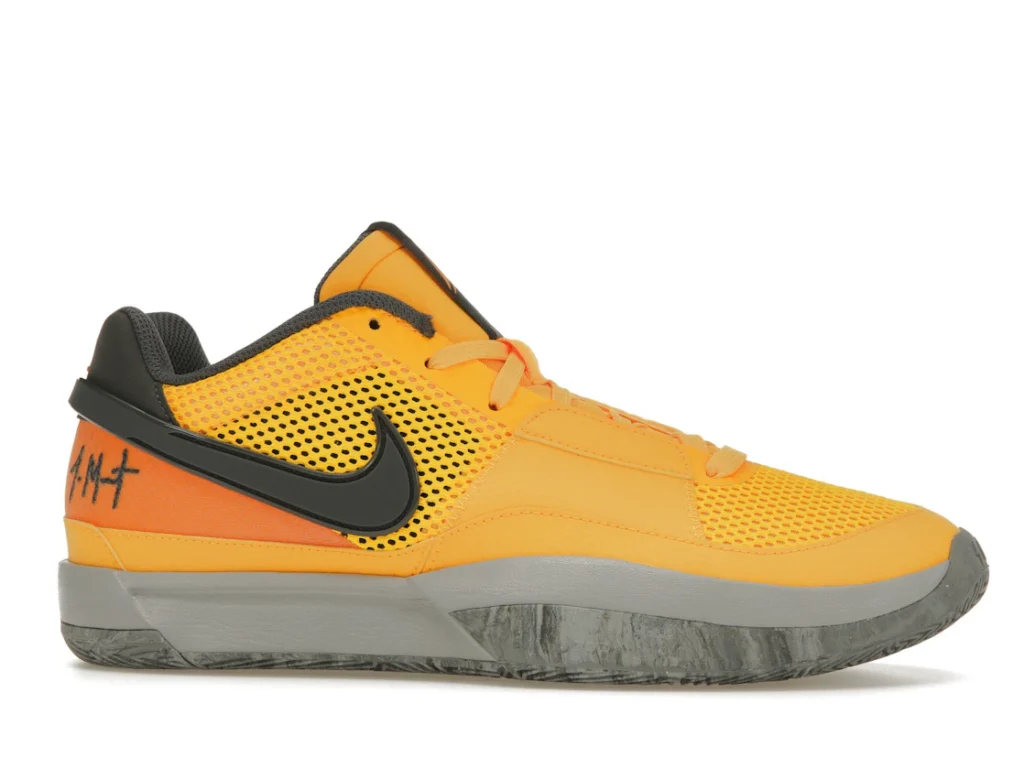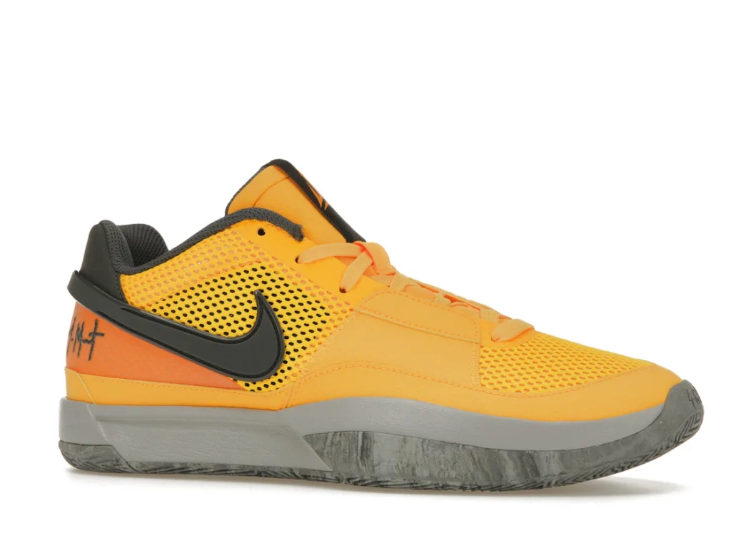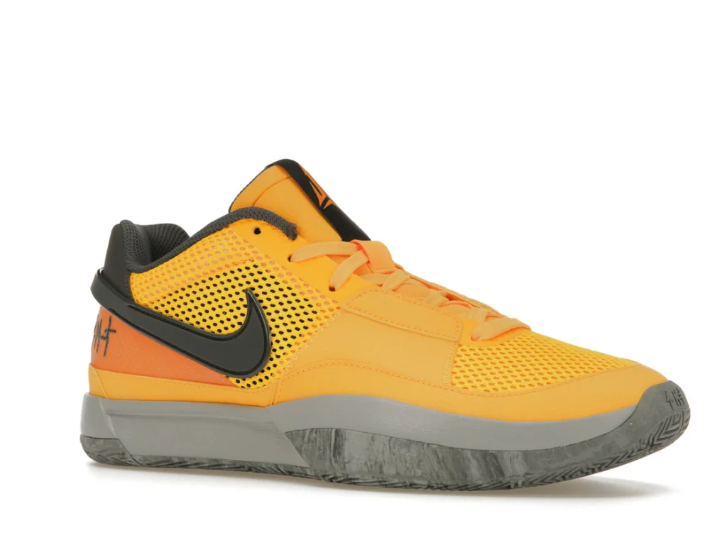 Although the shoe features a Laser Orange, Iron Grey, and Black colorway, the dominant tone is bright orange. The upper is made of breathable mesh, while the mudguard and overlays are crafted from smooth leather. In terms of branding, the ‘Ja’ insignia can be found on the tongue and the number 12 is stitched across the leather heel tab. The sneaker boasts a Zoom Air unit in the midsole to cushion impact without adding weight.