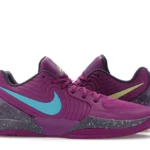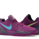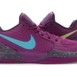 This is an updated version of the hugely popular Nike Ja 1. It benefits from additional padding around the ankle cuff and a new waterfall collar. The colorway features magenta ripple panels with a pastel blue swoosh. The lower heel and side soles have contoured gray segments that evoke stars in the Milky Way. A suede toe box completes the look.