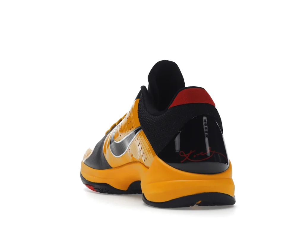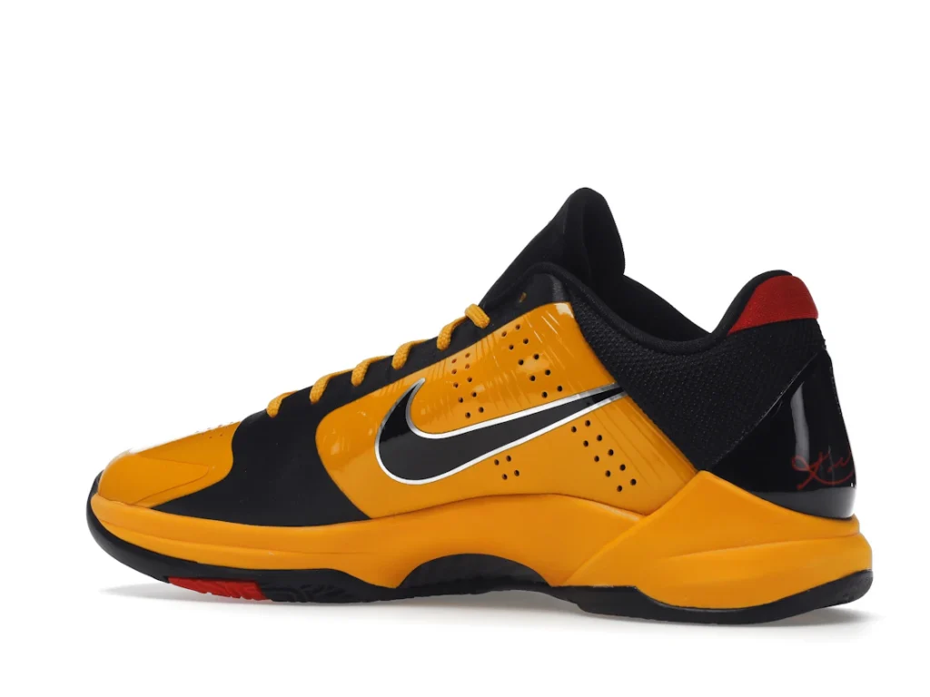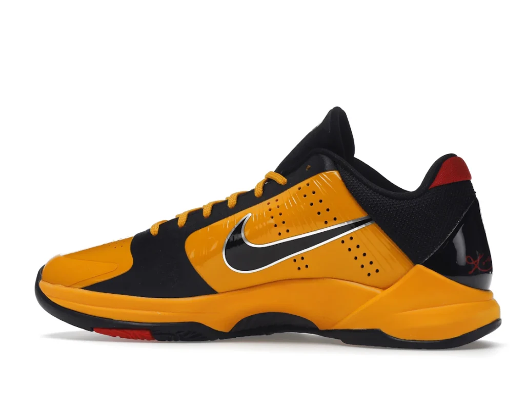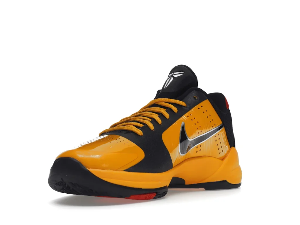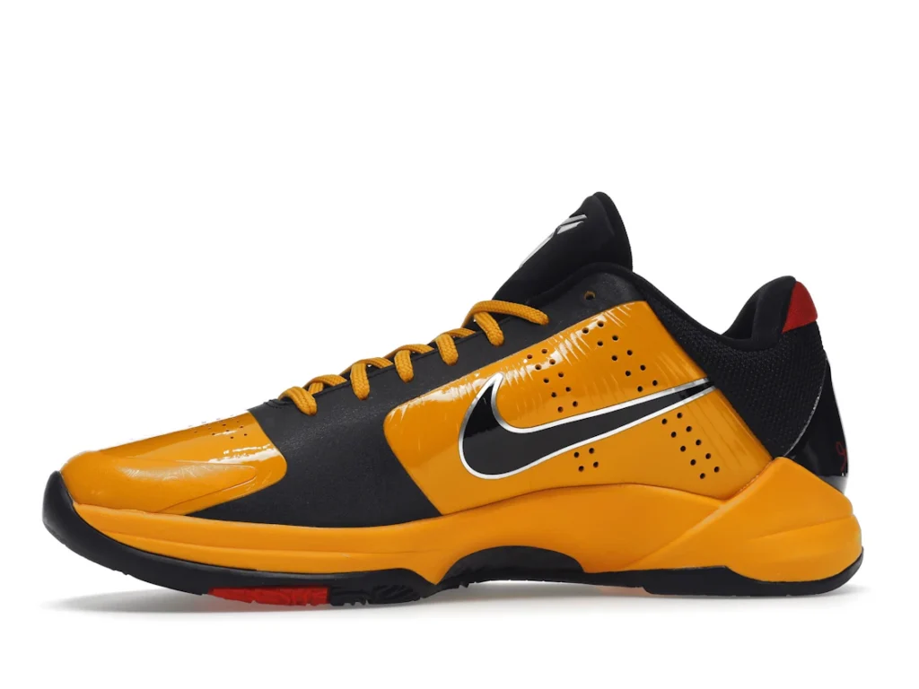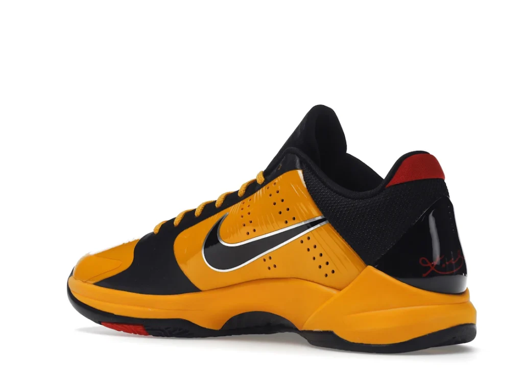 The Kobe V Protro Bruce Lee is inspired by two classic Bruce Lee films, Game of Death and Enter the Dragon. Black and Yellow paneling on the upper pays homage to the one-piece jumpsuit that Lee wore in Game of Death (famously duplicated in Kill Bill), while the red scratch marks on the lateral side pay tribute to the final fight sequence from Enter The Dragon.