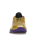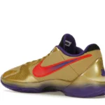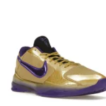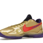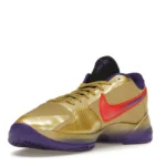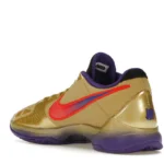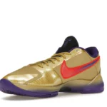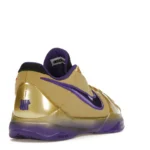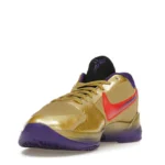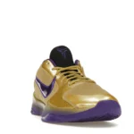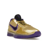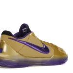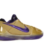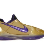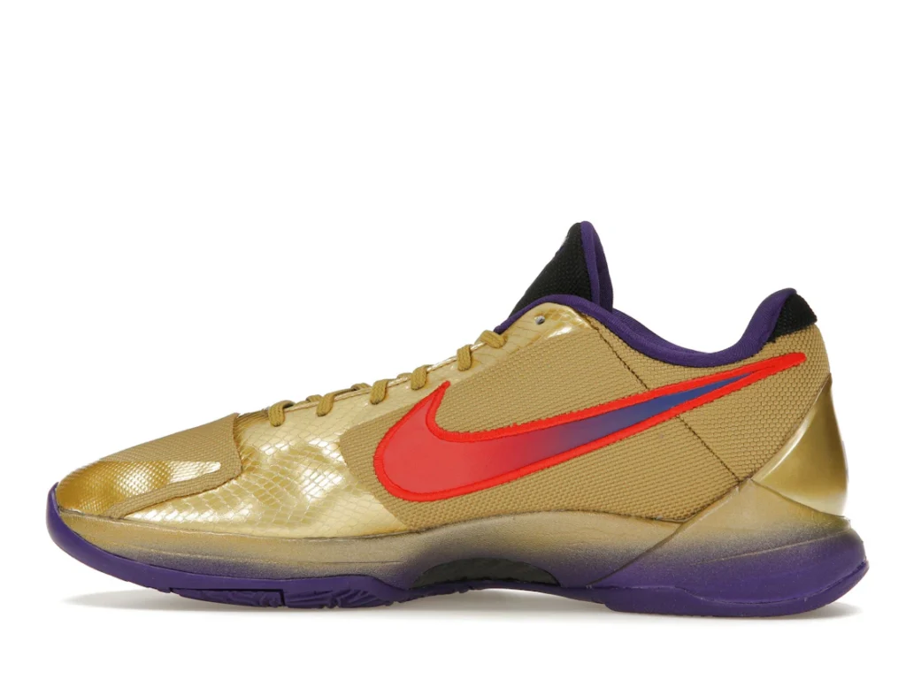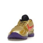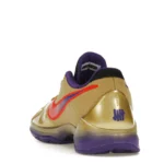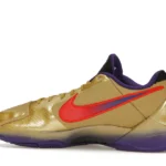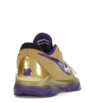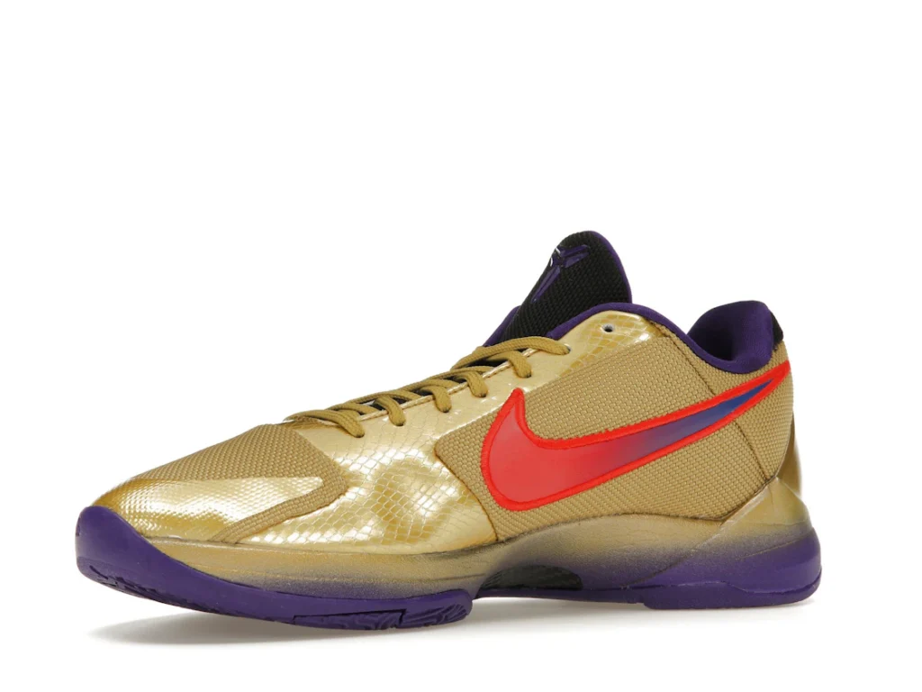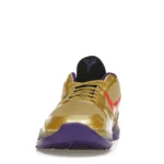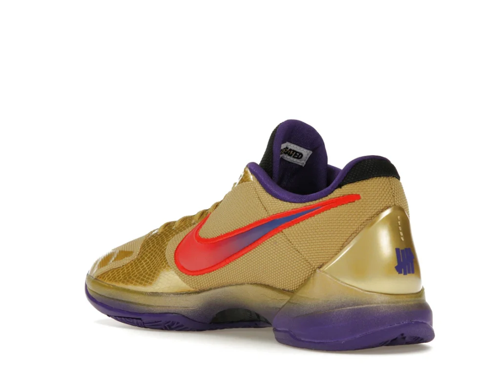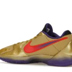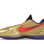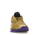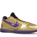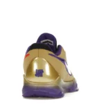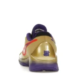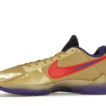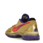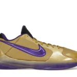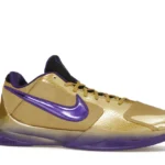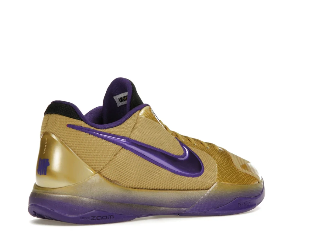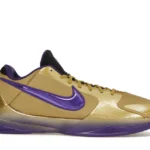The Nike Kobe 5 Protro Undefeated Hall of Fame arrives in gold, purple, and black, a colorway that pays homage to the Mamba and his Lakers legacy. The Nike Kobe 5 Protro Undefeated Hall of Fame features a gold-colored, textured upper with mesh toe boxes and side paneling. Snakeskin-textured overlays add nuance on the tops, and each shoe is accented with a purple Swoosh on the right side panel and pink Swoosh on the left, with the numbers 24, 10, and 8 inscribed on the pink Swoosh. Below, Zoom Air provides additional cushioning.