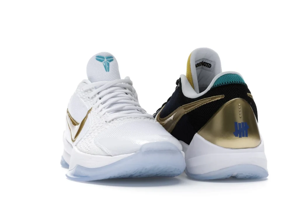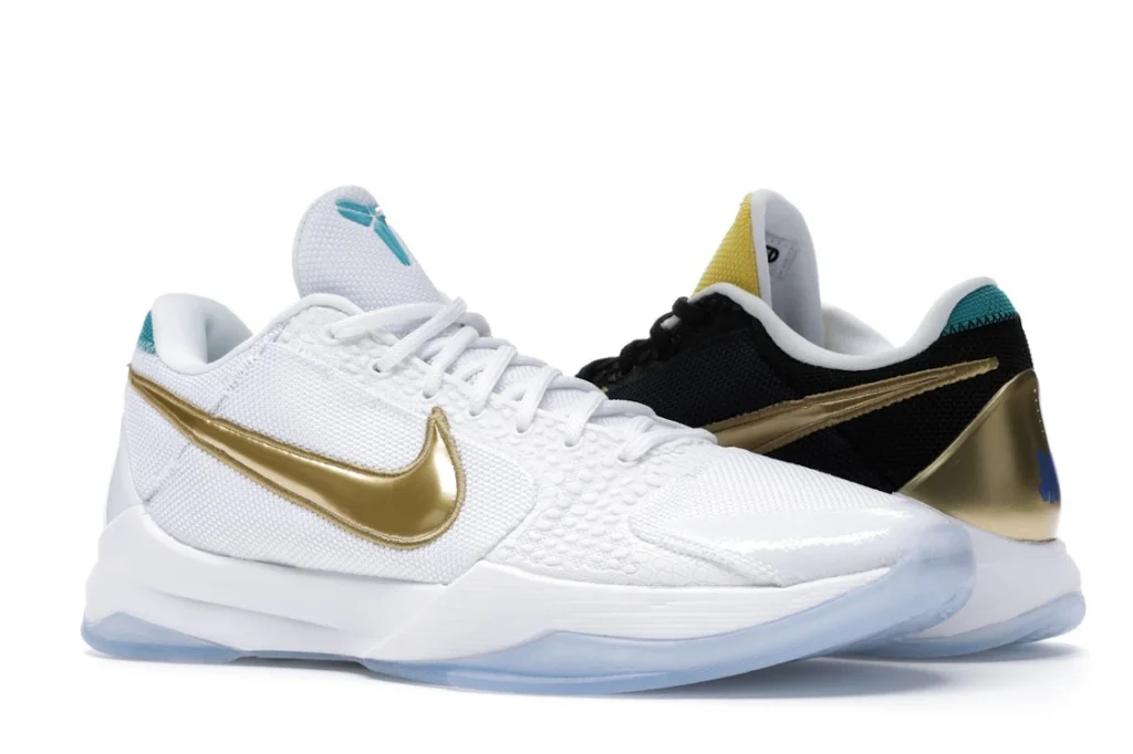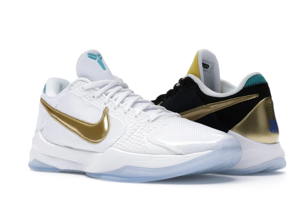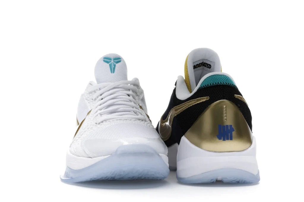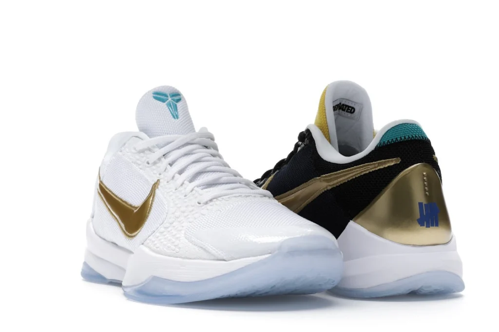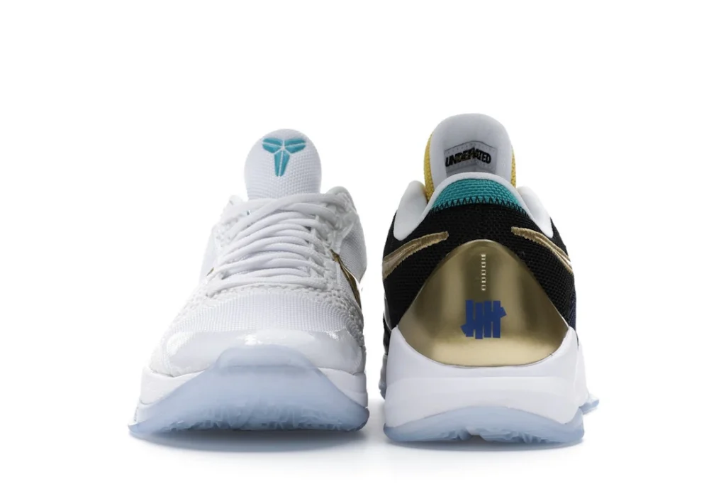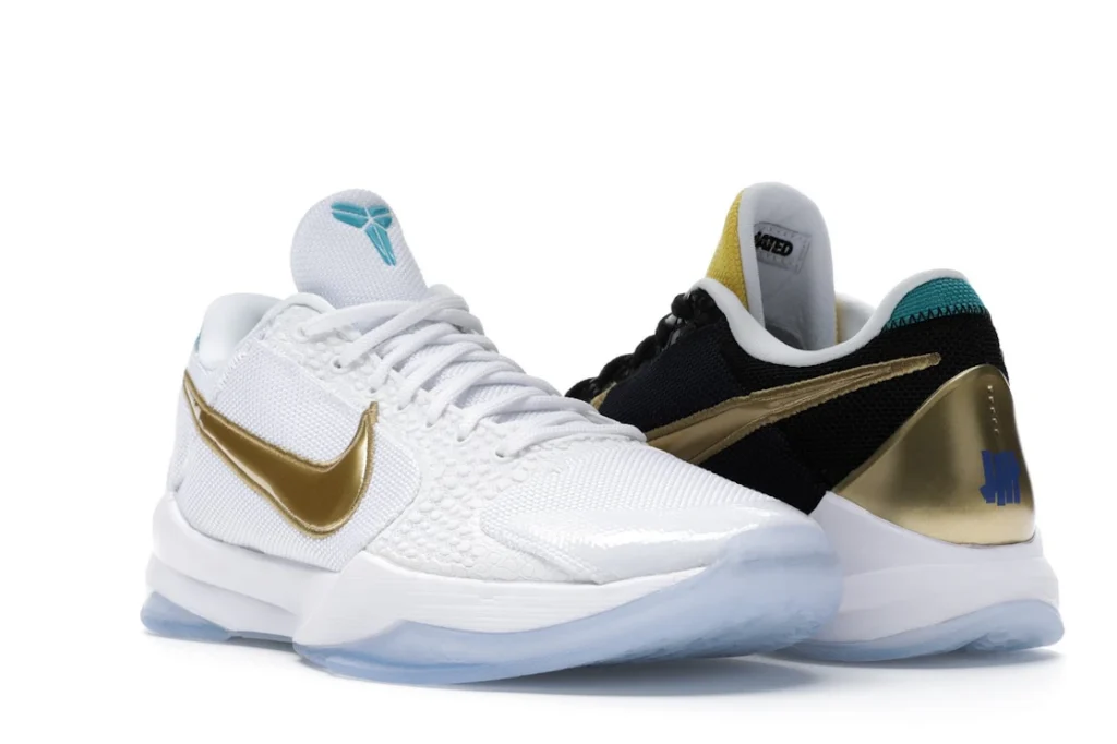 The Nike Kobe 5 Protro Undefeated What If Pack features a white mesh upper with golden Swooshes on the right shoe and a black mesh upper with golden Swooshes on the left shoe. From there, a two-toned, textured forefoot and a translucent, cushioned outsole complete the design.