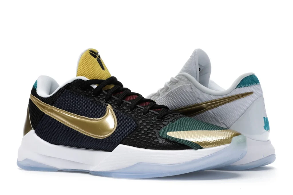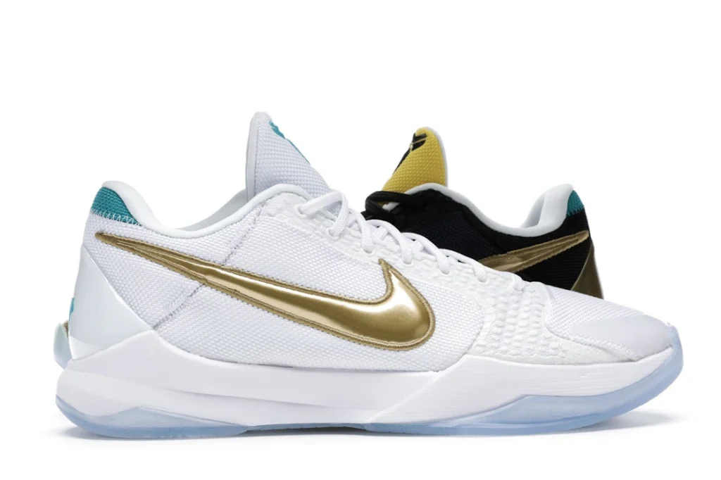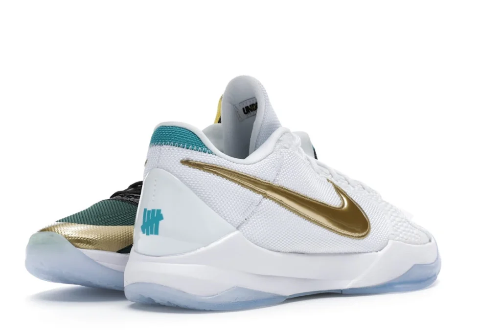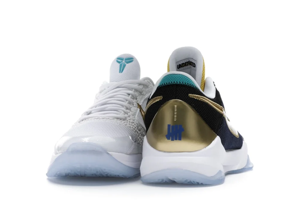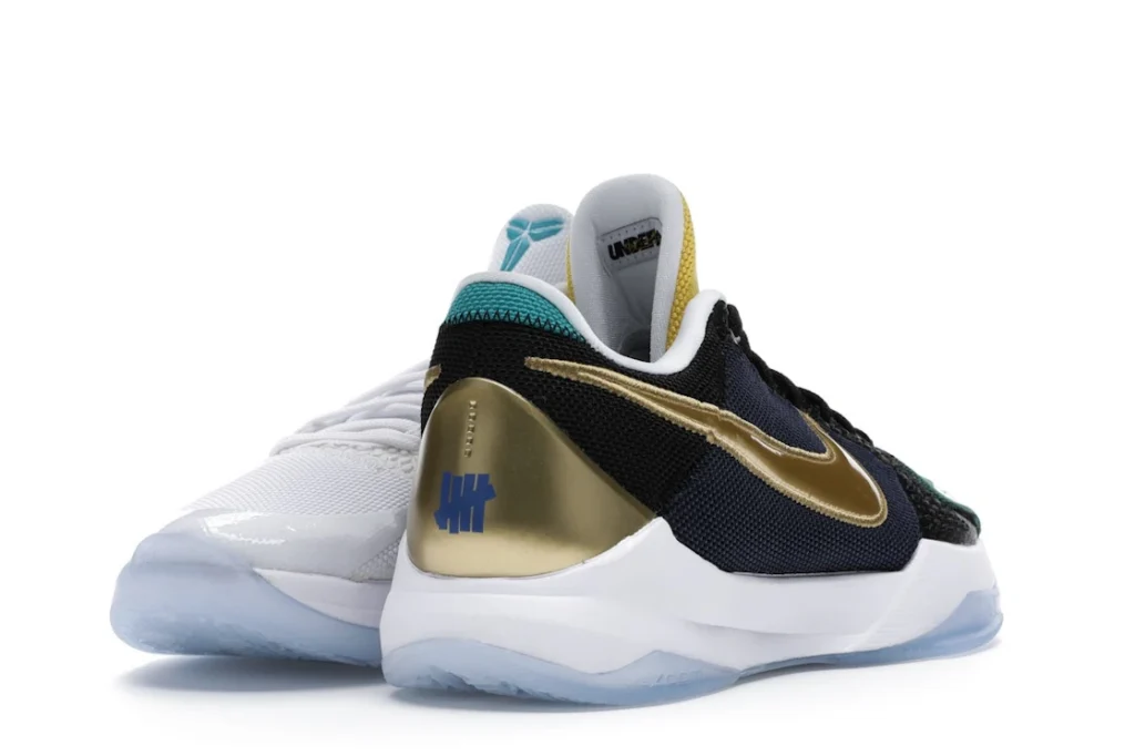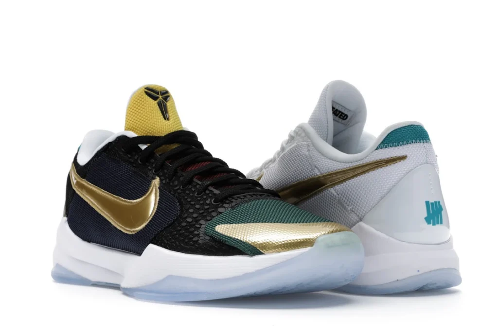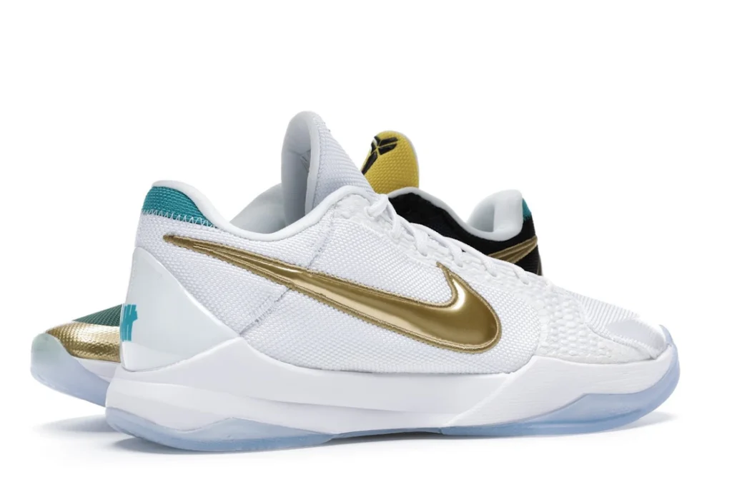 The Nike Kobe 5 Protro Undefeated What If Pack features a white mesh upper with golden Swooshes on the right shoe and a black mesh upper with golden Swooshes on the left shoe. From there, a two-toned, textured forefoot and a translucent, cushioned outsole complete the design.