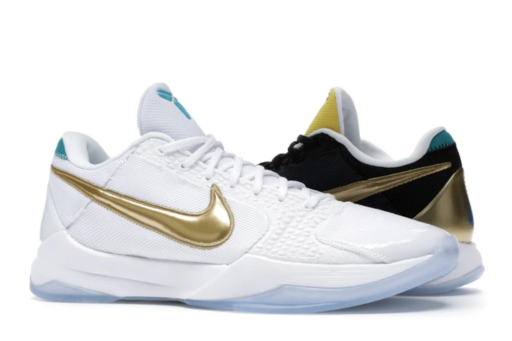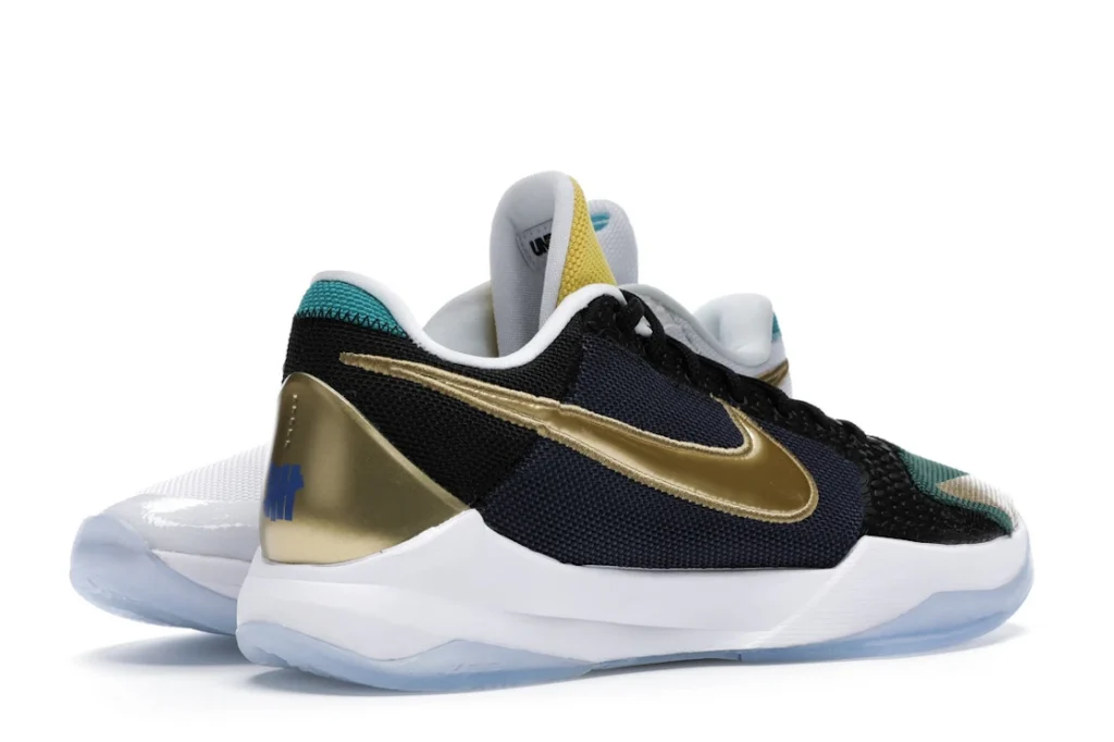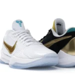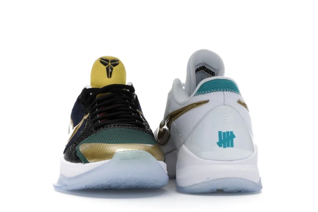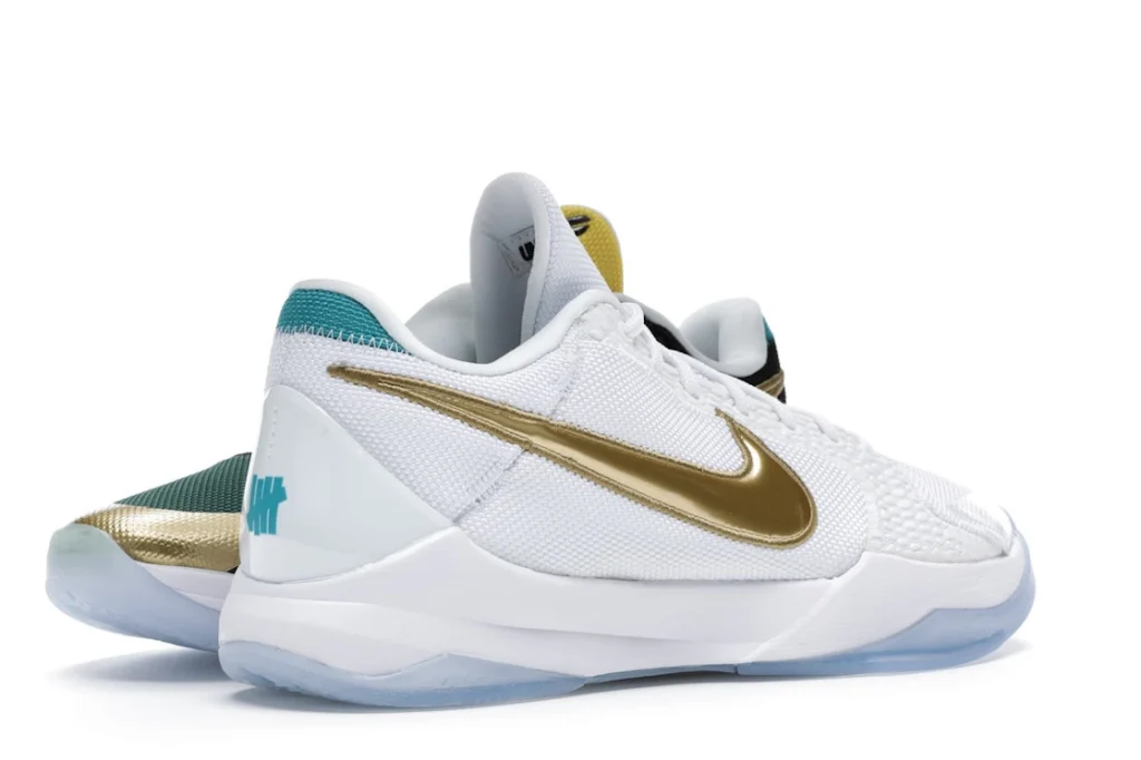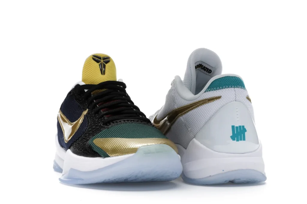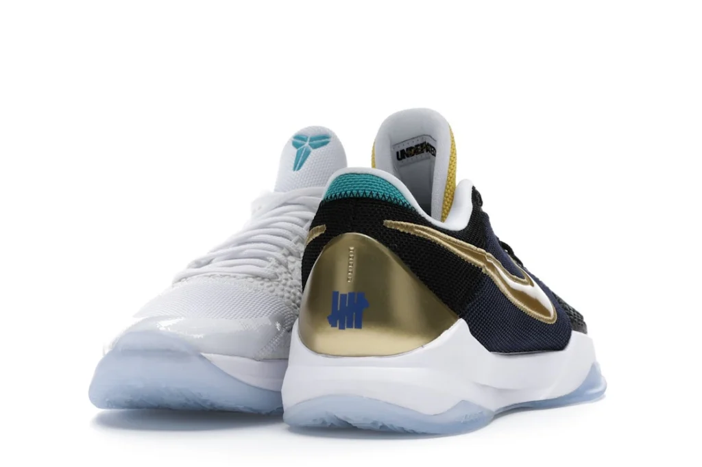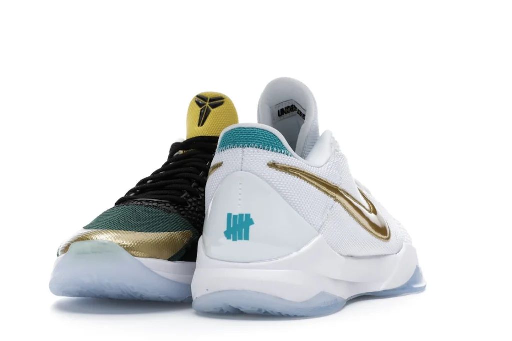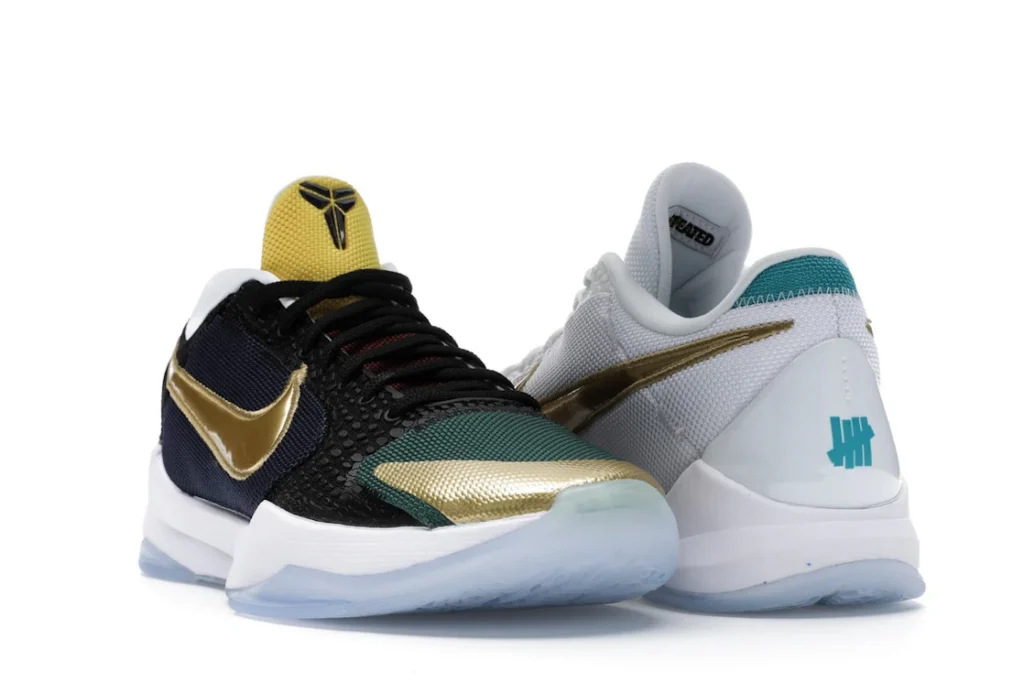 The Nike Kobe 5 Protro Undefeated What If Pack features a white mesh upper with golden Swooshes on the right shoe and a black mesh upper with golden Swooshes on the left shoe. From there, a two-toned, textured forefoot and a translucent, cushioned outsole complete the design.
