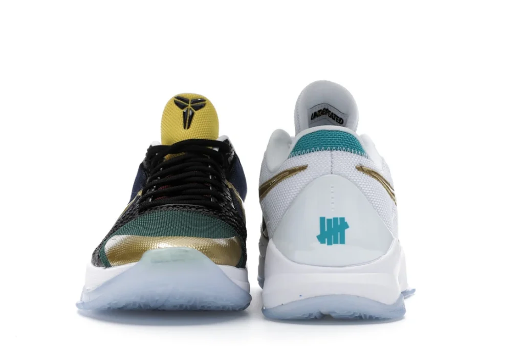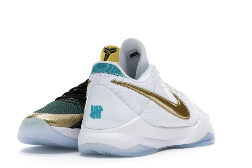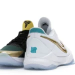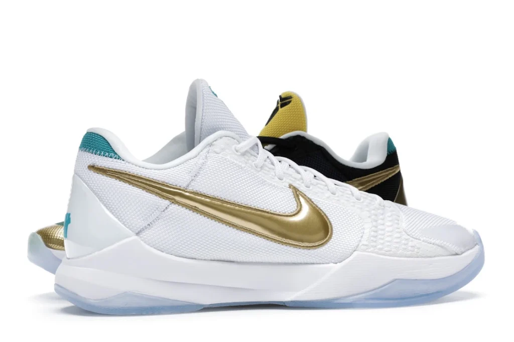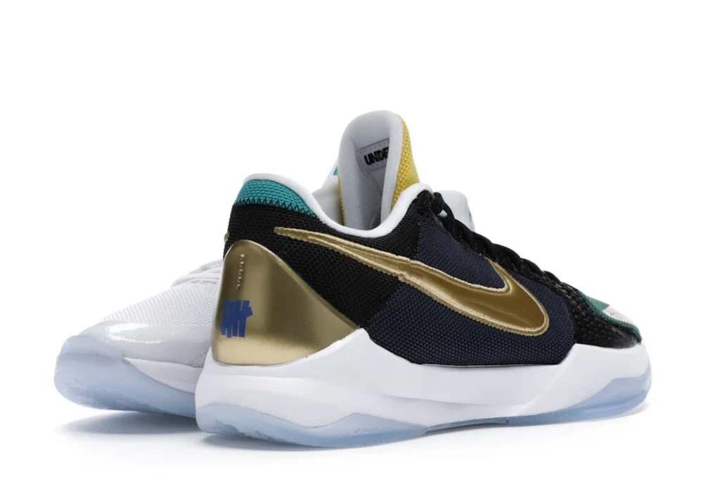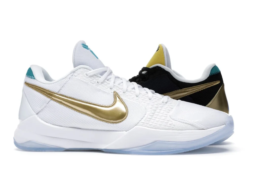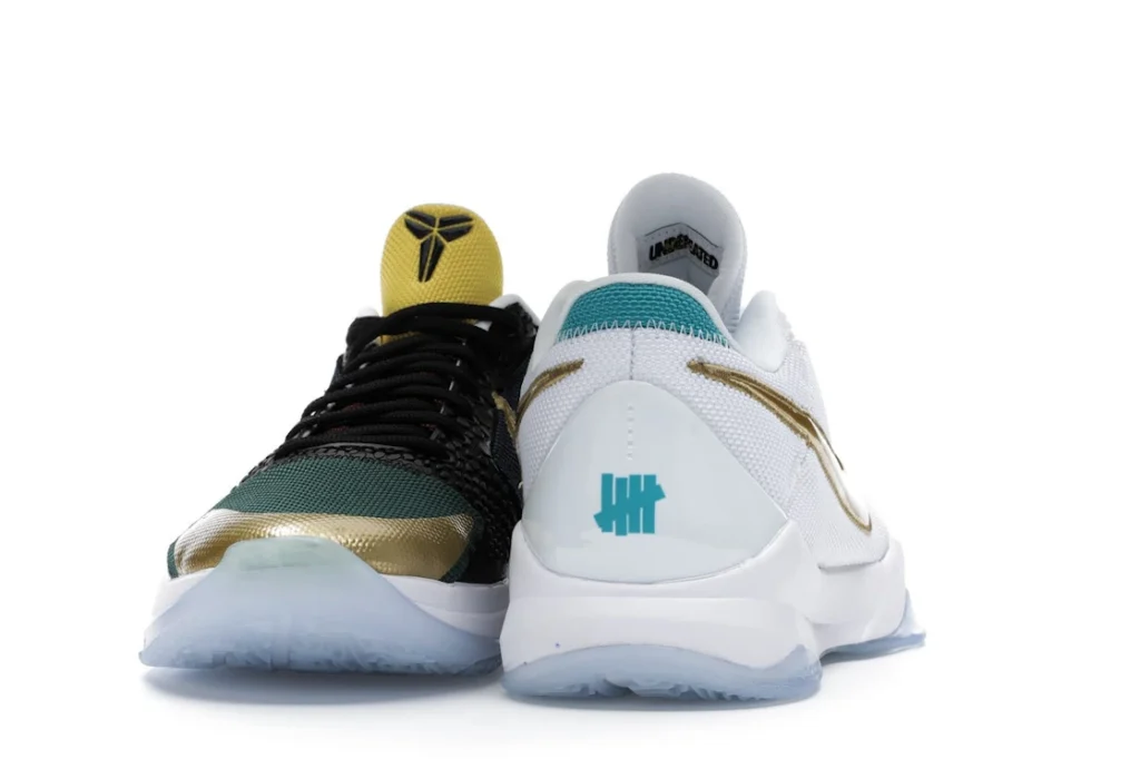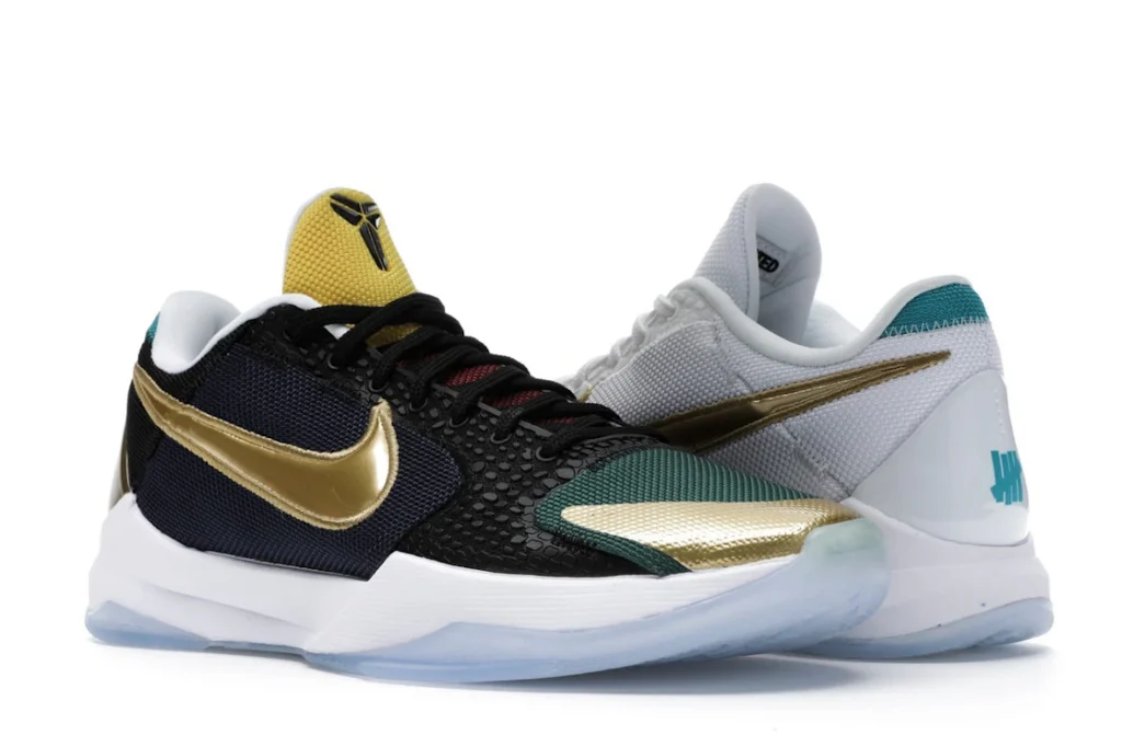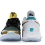 The Nike Kobe 5 Protro Undefeated What If Pack features a white mesh upper with golden Swooshes on the right shoe and a black mesh upper with golden Swooshes on the left shoe. From there, a two-toned, textured forefoot and a translucent, cushioned outsole complete the design.