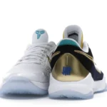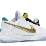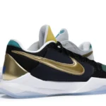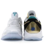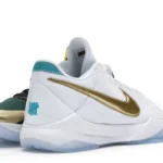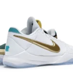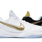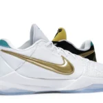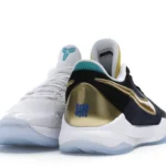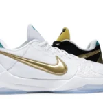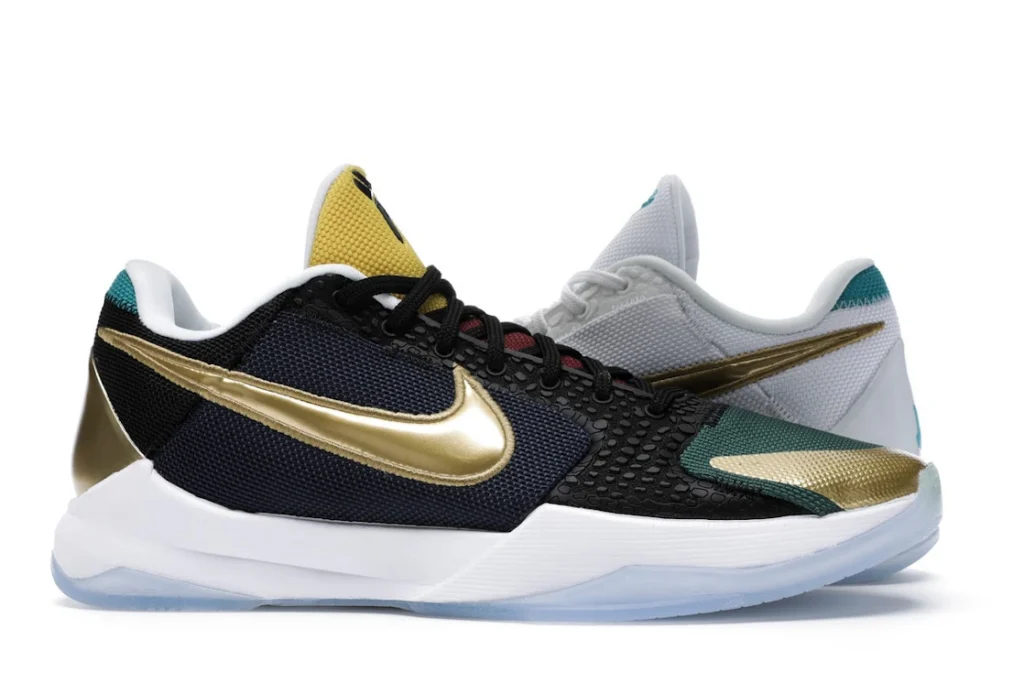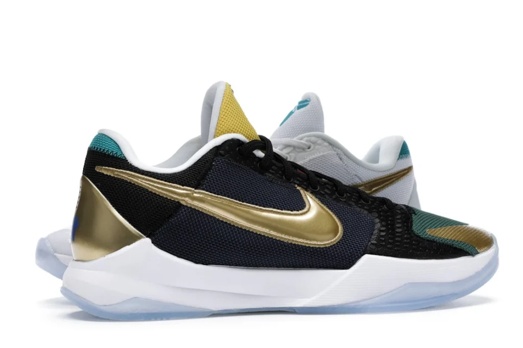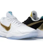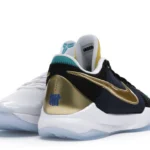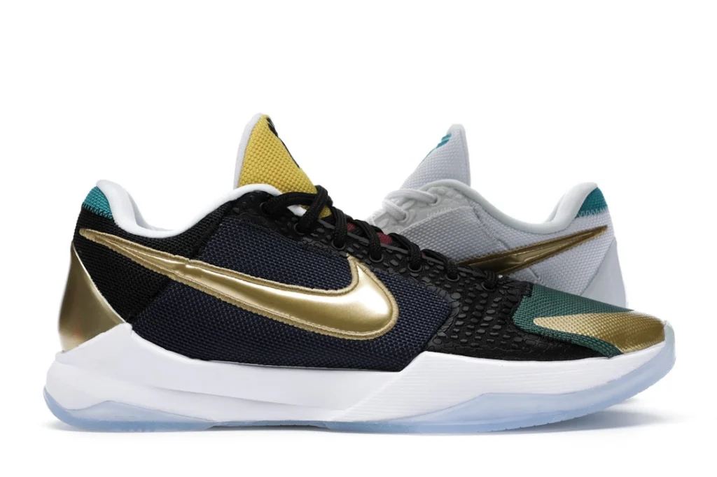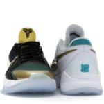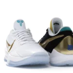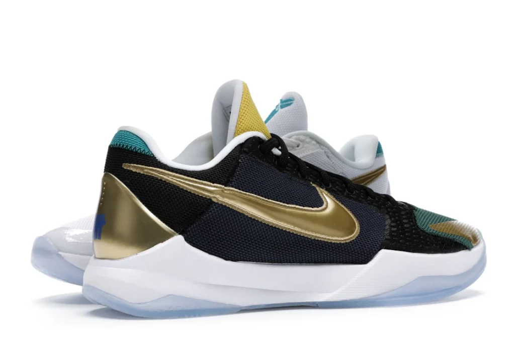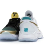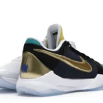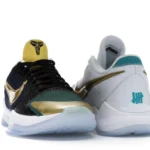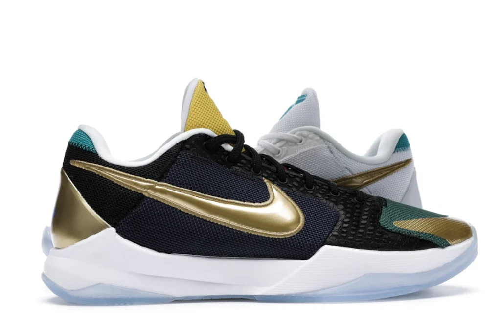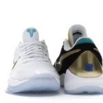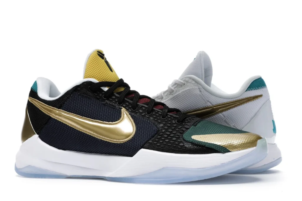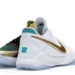 The Nike Kobe 5 Protro Undefeated What If Pack features a white mesh upper with golden Swooshes on the right shoe and a black mesh upper with golden Swooshes on the left shoe. From there, a two-toned, textured forefoot and a translucent, cushioned outsole complete the design.