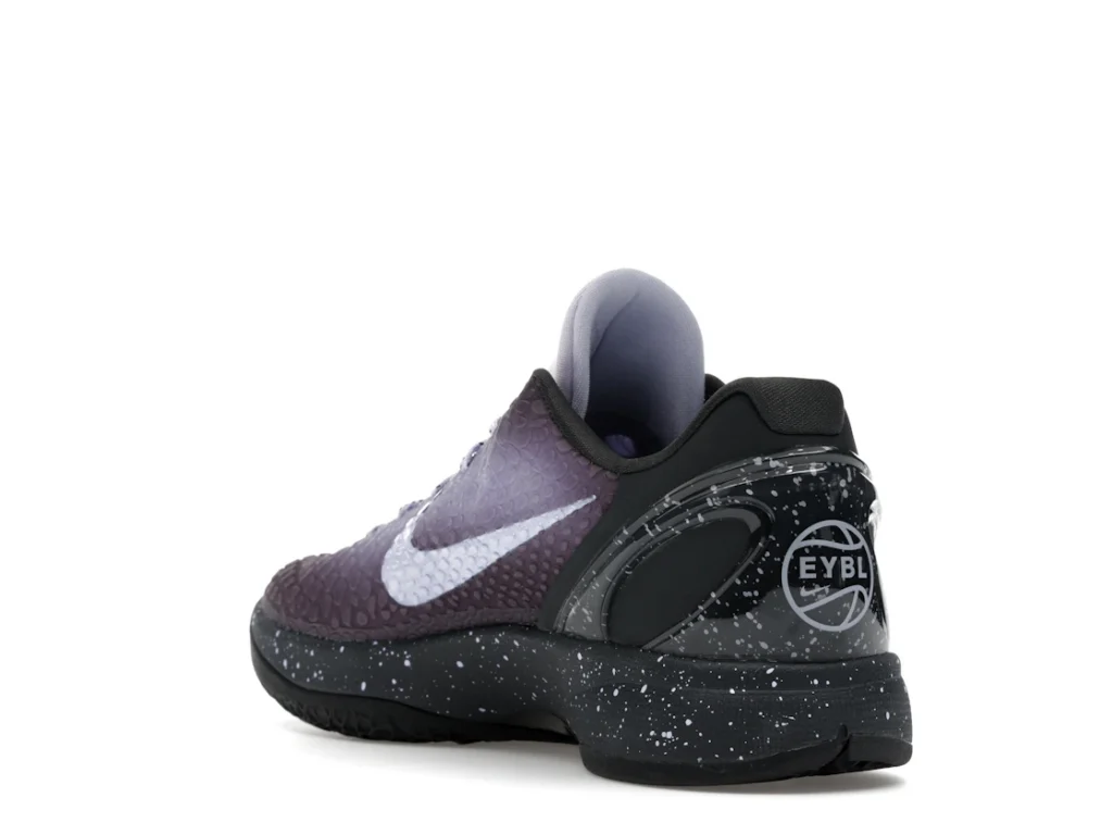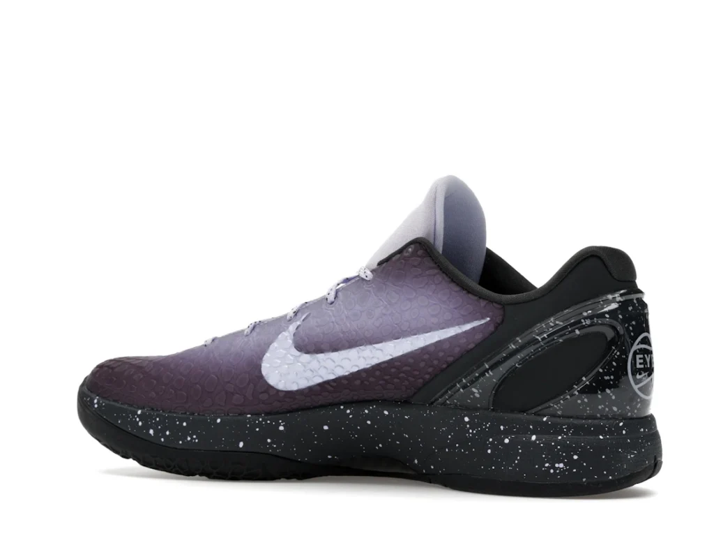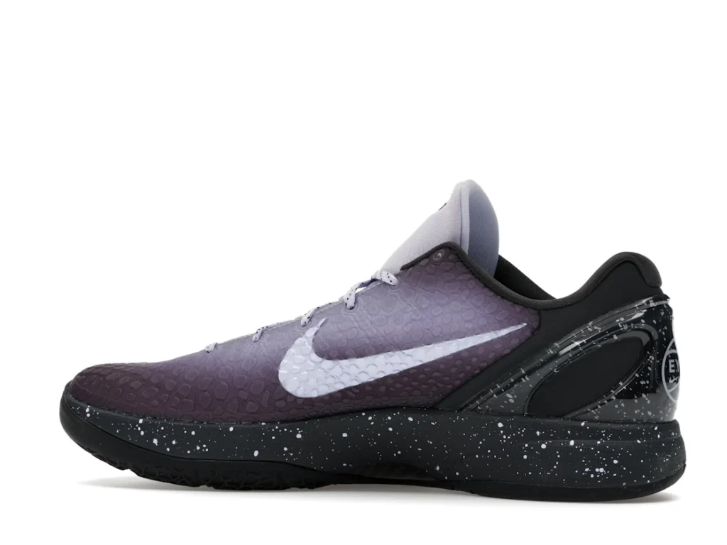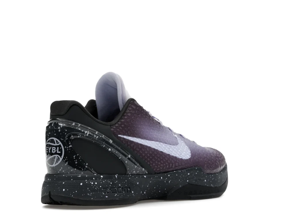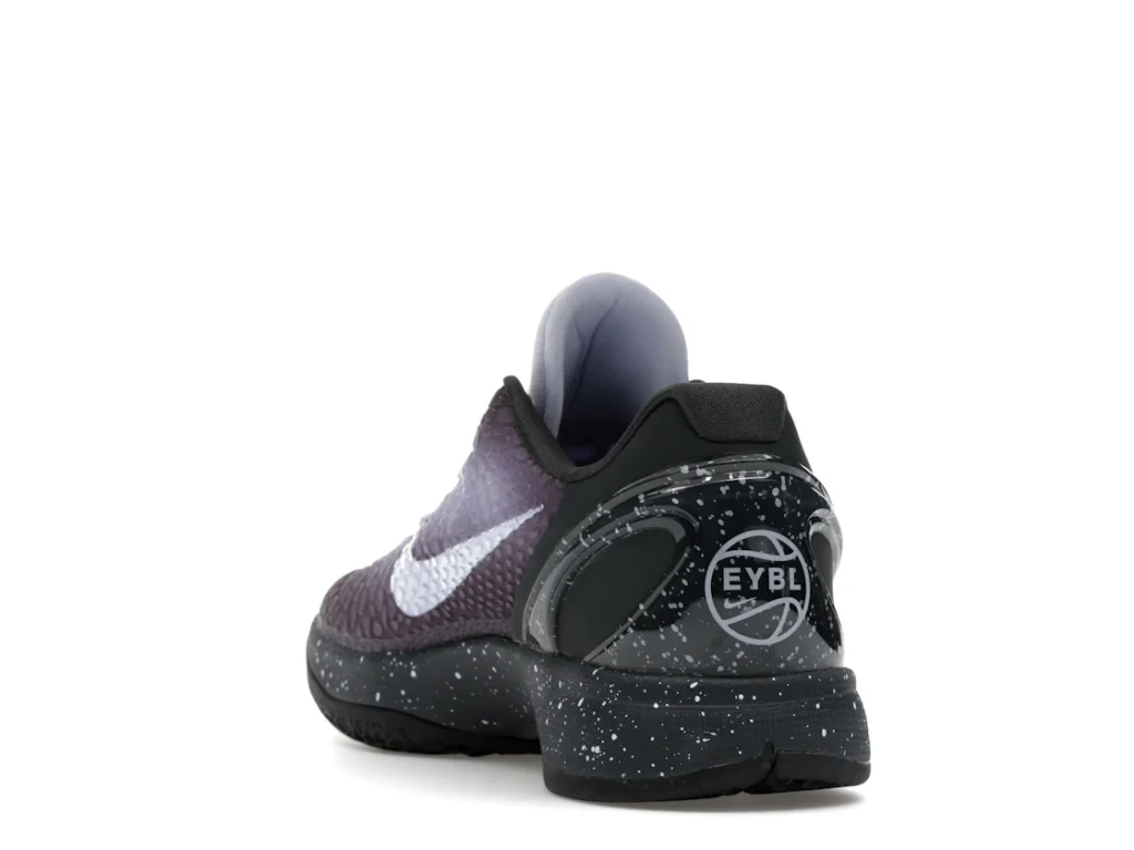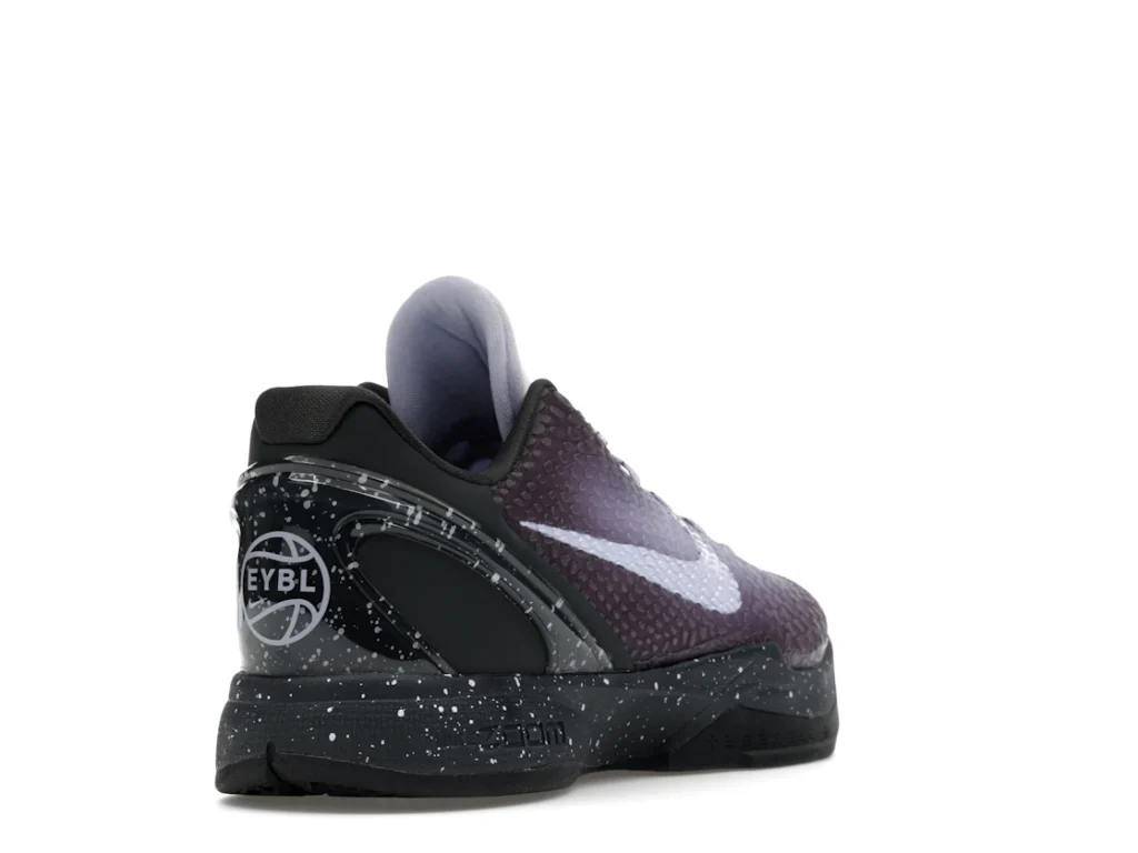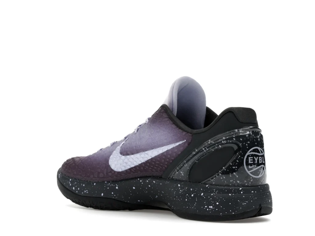 With a gradient snakeskin upper that fades from deep purple to ethereal lavender, the EYBL Nike Kobe 6 Protro is a professional shoe designed for both ballers and lifestyle sneaker enthusiasts. The black paint speckles on the heel and midsole give the shoe an other-worldly feel, and the Nike Swoosh sits in light lavender on the sides. The midsole features a TPU cage on the heel with the EYBKL branding and an inner Zoom Turbo Unit. The outsoles are made of rubber for quick turns and cuts.