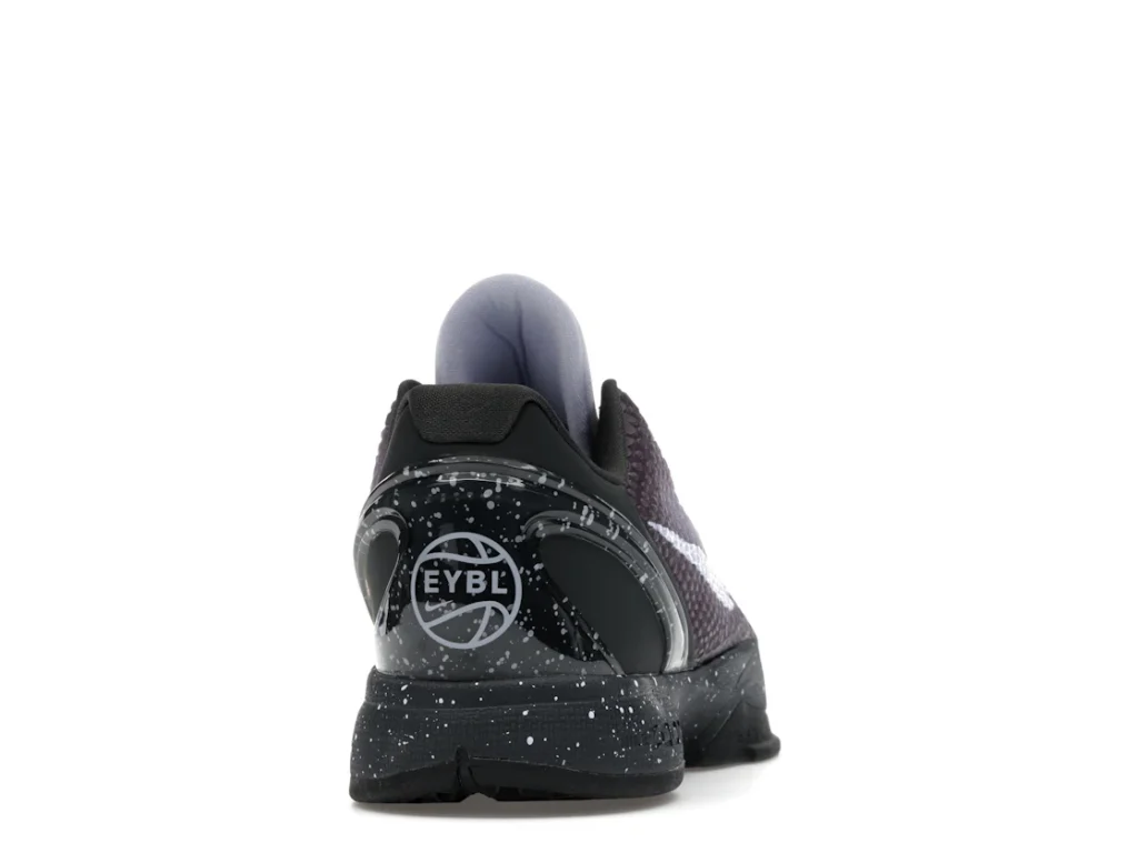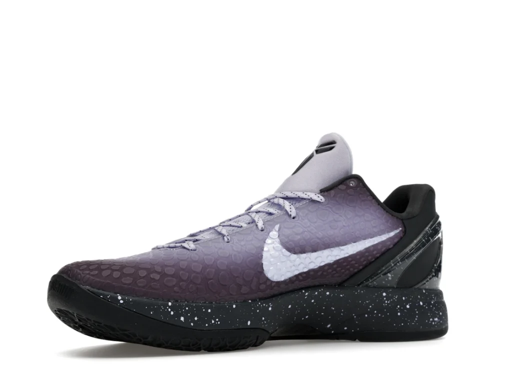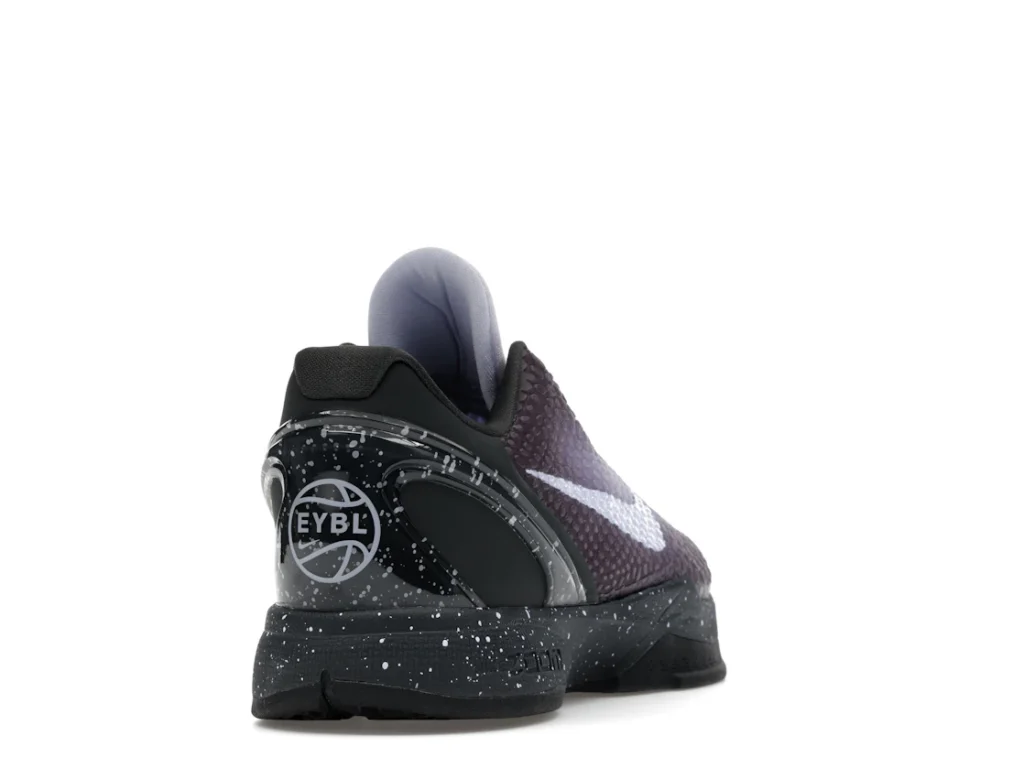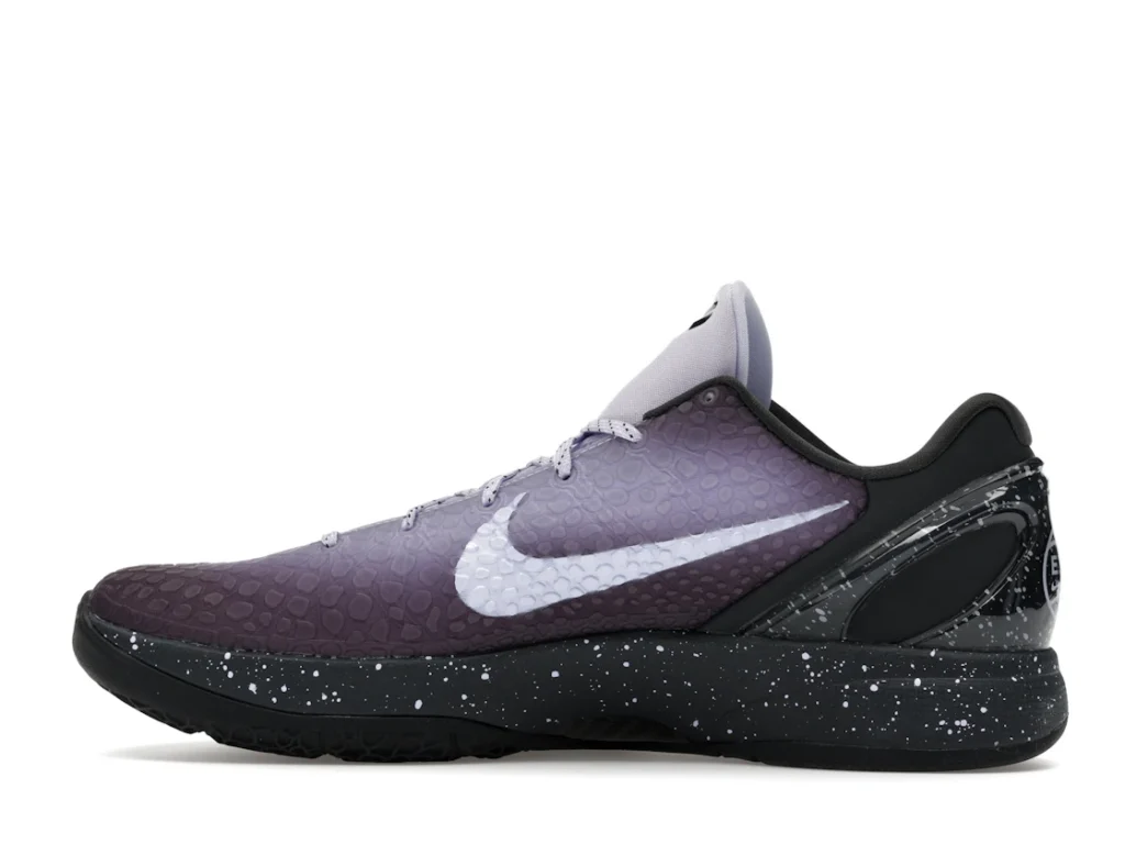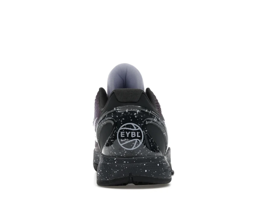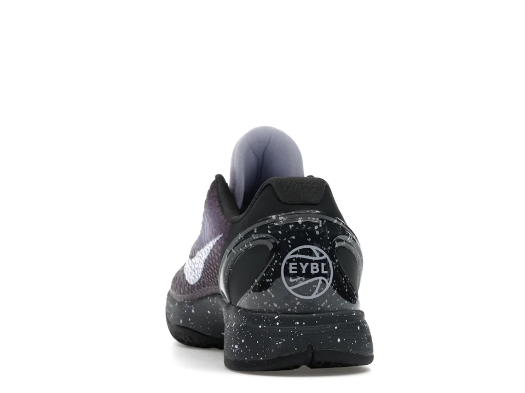 With a gradient snakeskin upper that fades from deep purple to ethereal lavender, the EYBL Nike Kobe 6 Protro is a professional shoe designed for both ballers and lifestyle sneaker enthusiasts. The black paint speckles on the heel and midsole give the shoe an other-worldly feel, and the Nike Swoosh sits in light lavender on the sides. The midsole features a TPU cage on the heel with the EYBKL branding and an inner Zoom Turbo Unit. The outsoles are made of rubber for quick turns and cuts.