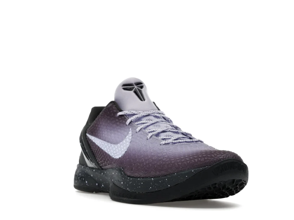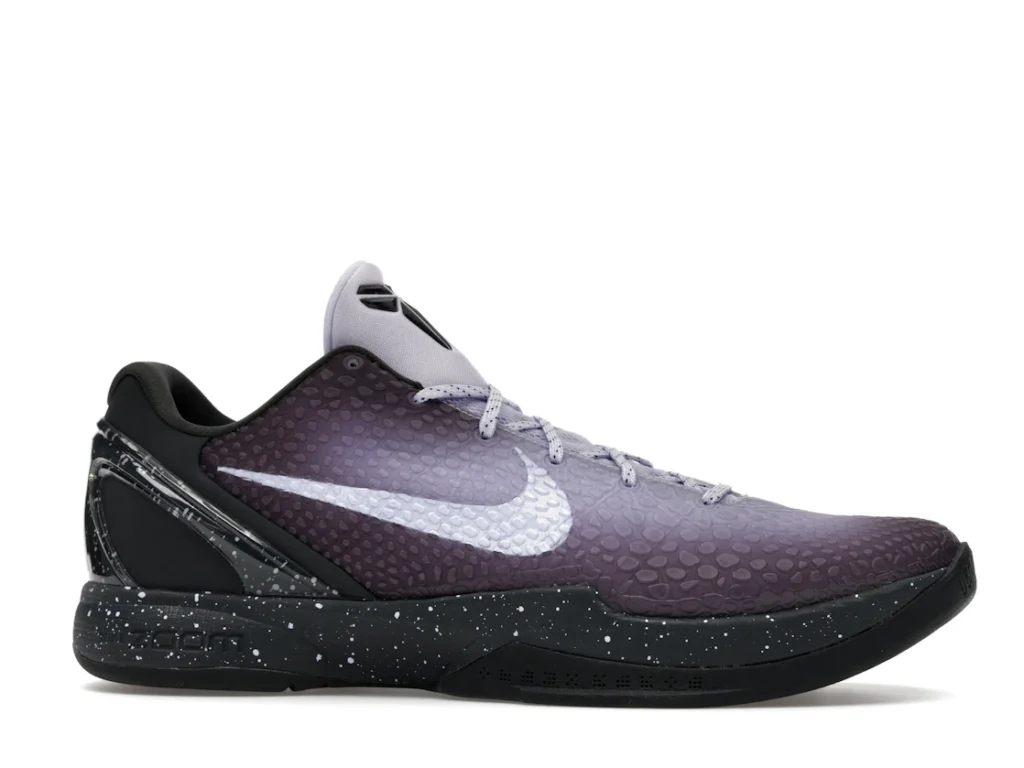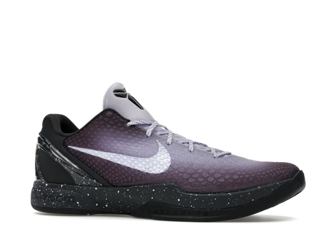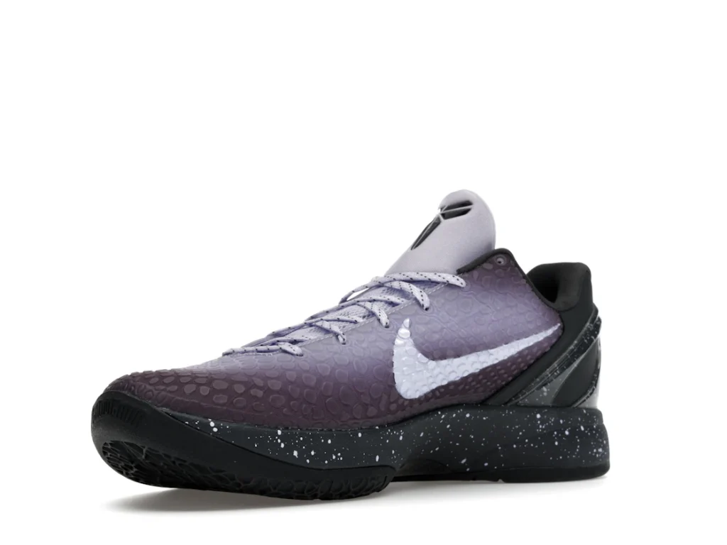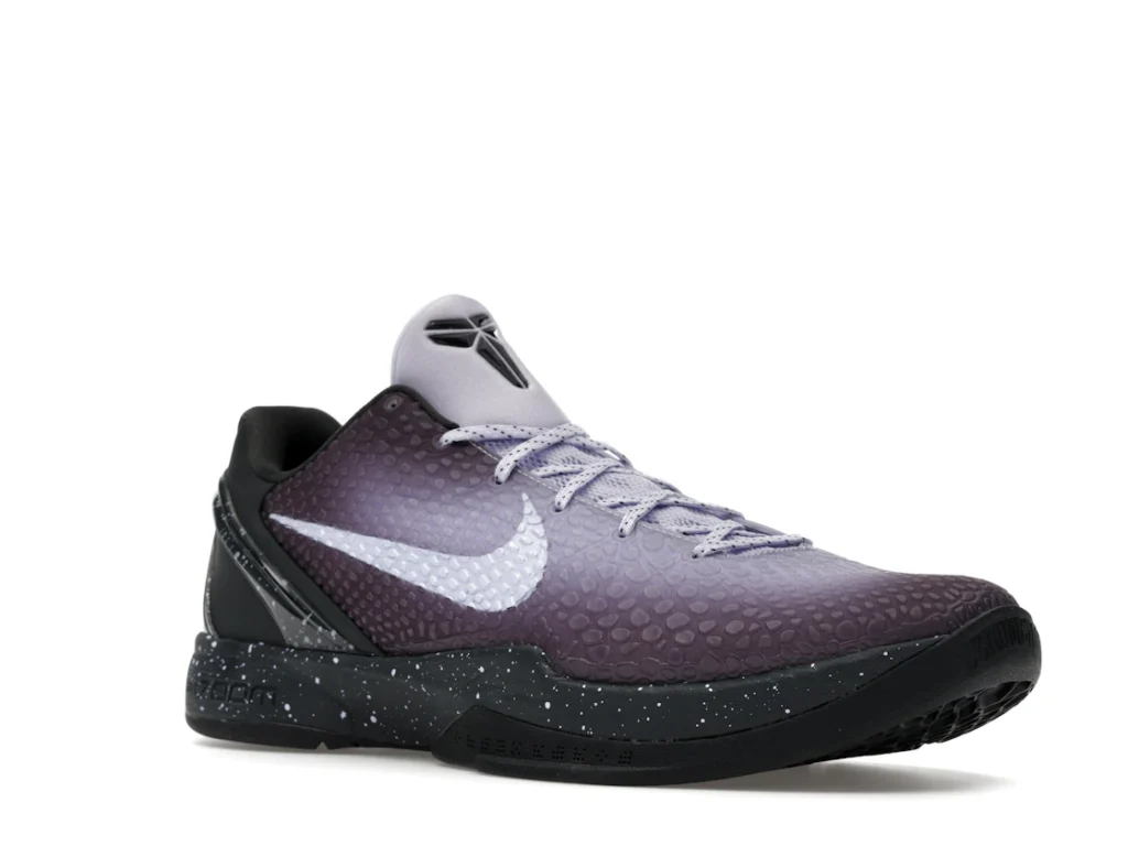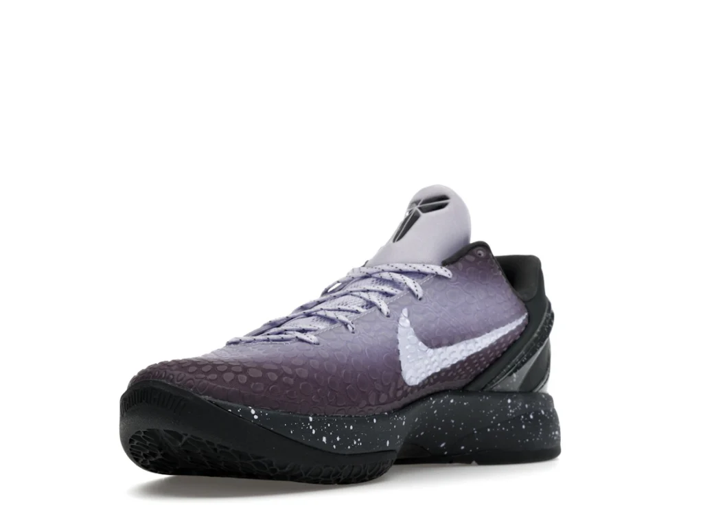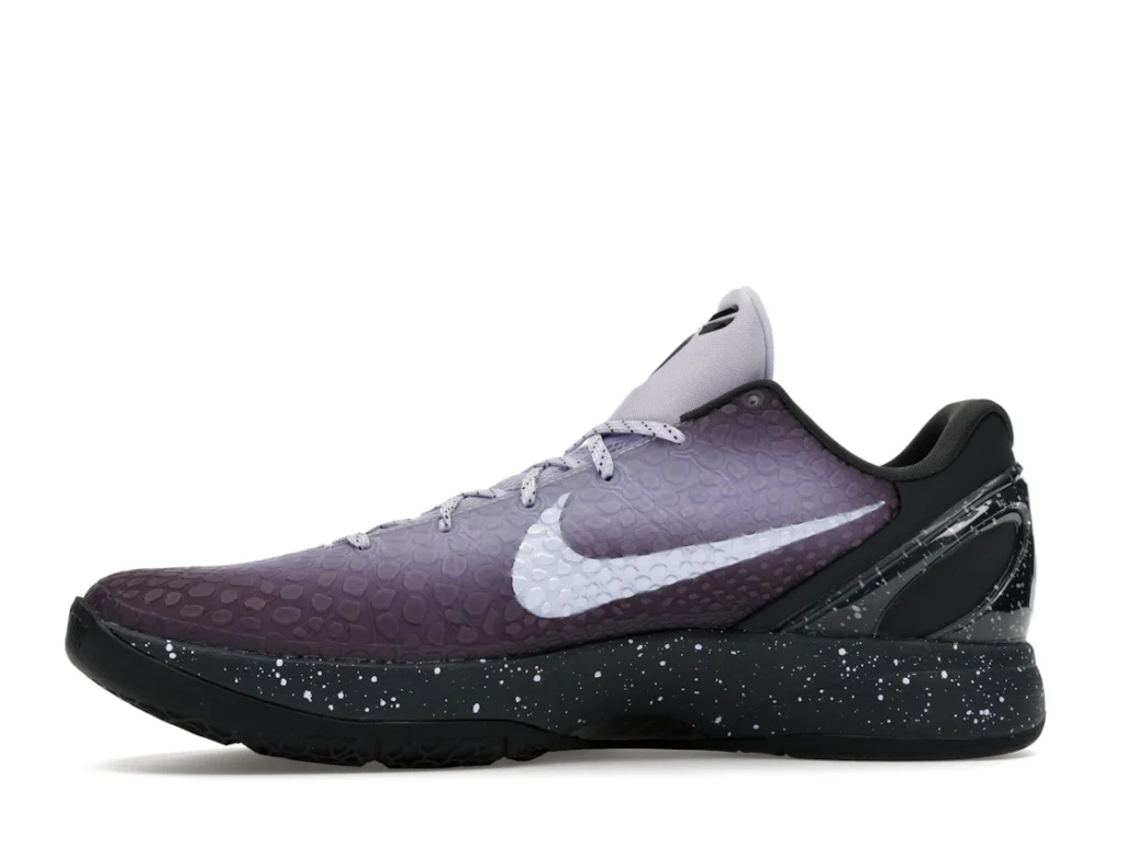 With a gradient snakeskin upper that fades from deep purple to ethereal lavender, the EYBL Nike Kobe 6 Protro is a professional shoe designed for both ballers and lifestyle sneaker enthusiasts. The black paint speckles on the heel and midsole give the shoe an other-worldly feel, and the Nike Swoosh sits in light lavender on the sides. The midsole features a TPU cage on the heel with the EYBKL branding and an inner Zoom Turbo Unit. The outsoles are made of rubber for quick turns and cuts.