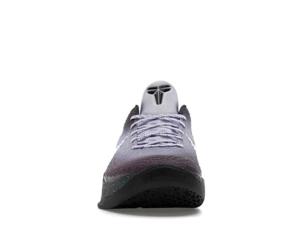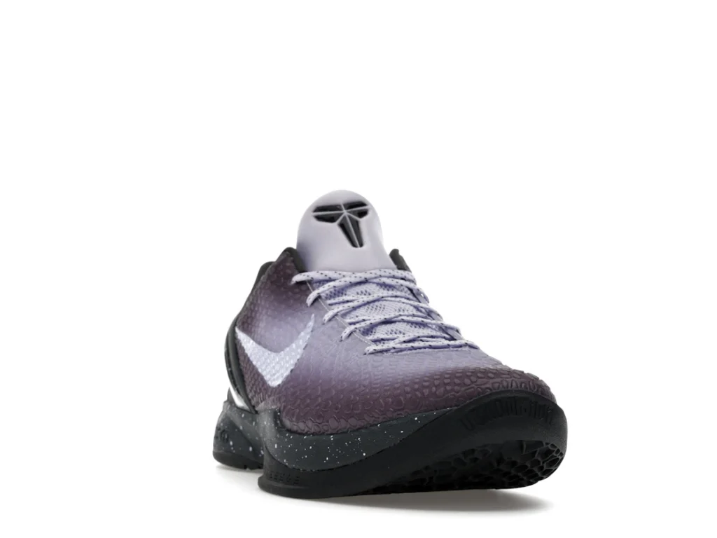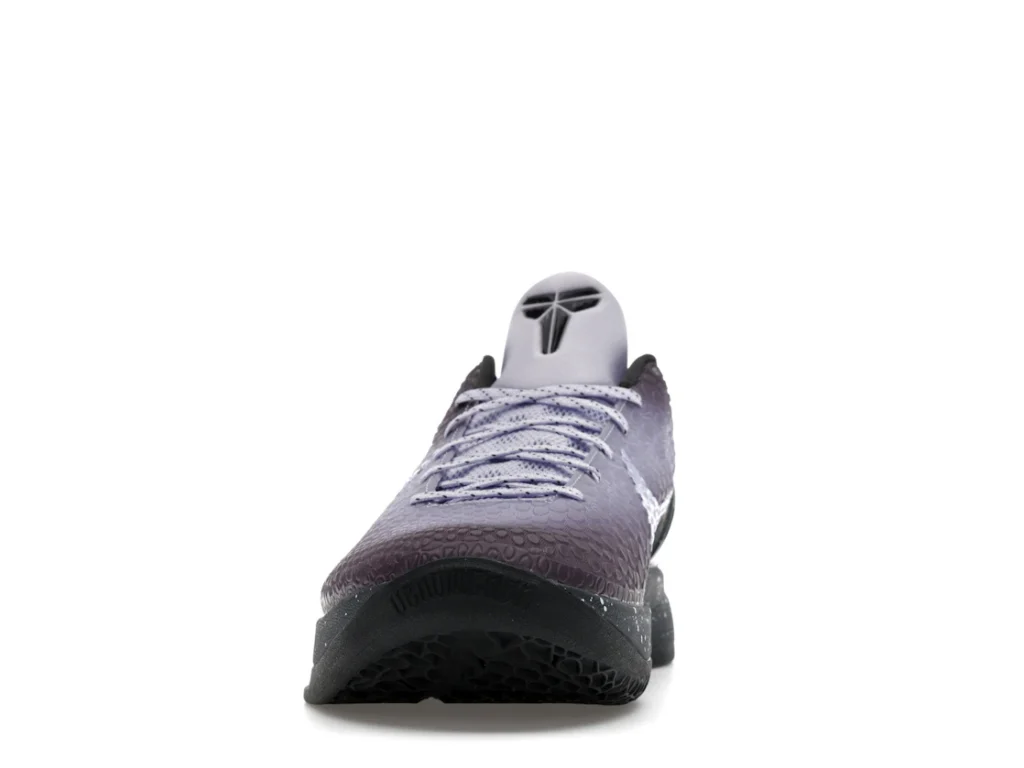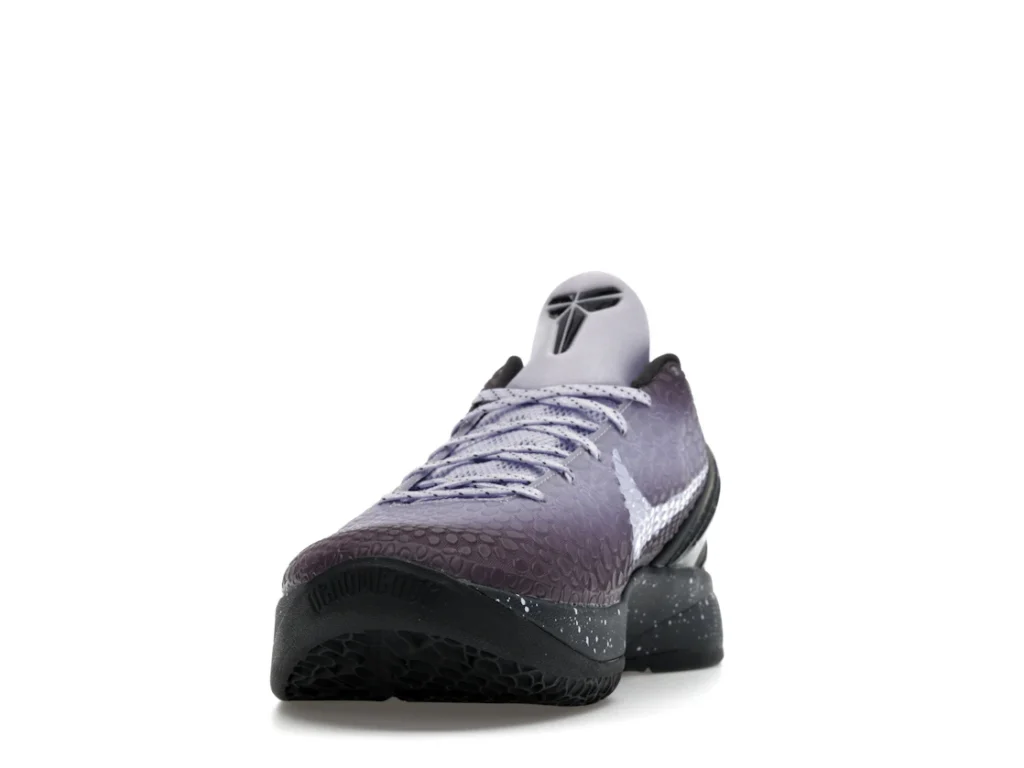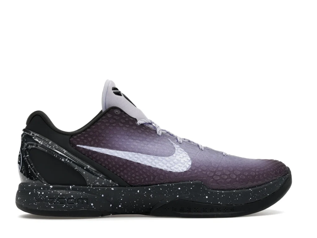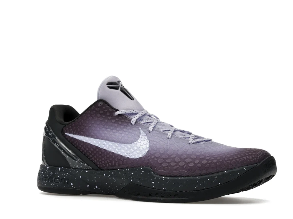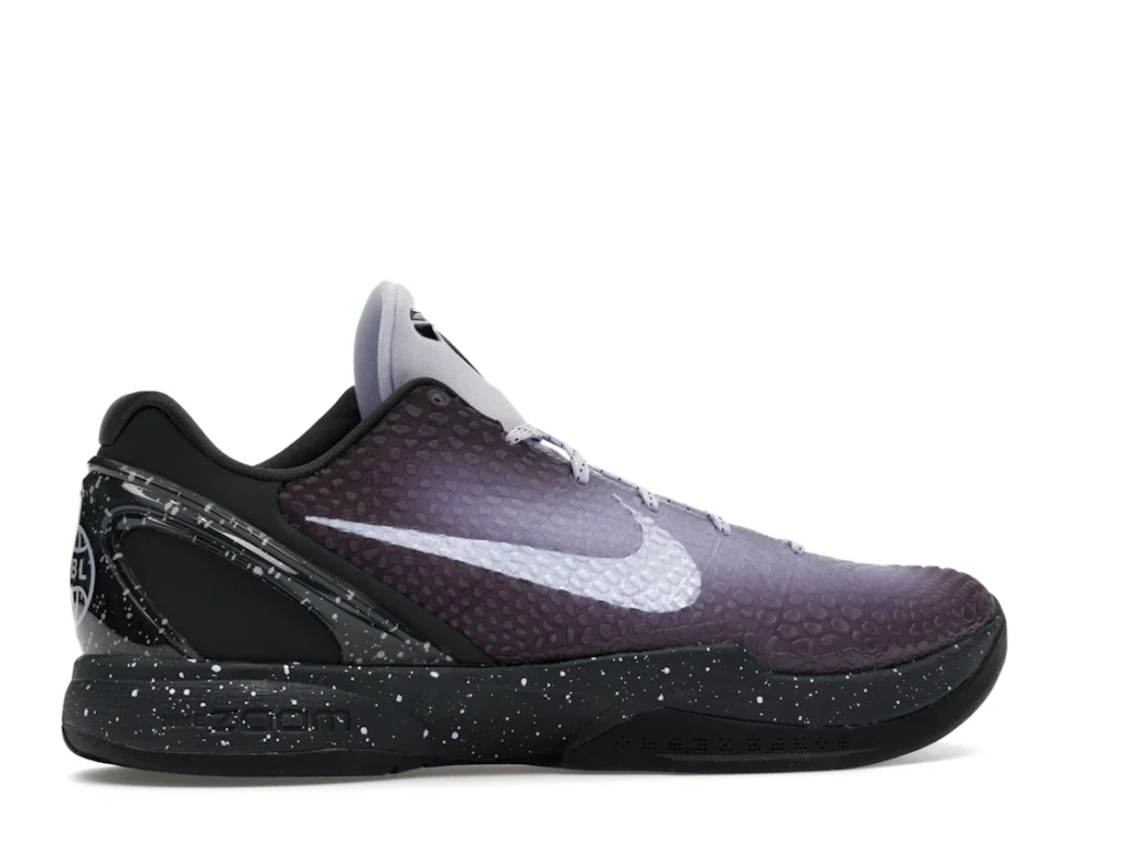 With a gradient snakeskin upper that fades from deep purple to ethereal lavender, the EYBL Nike Kobe 6 Protro is a professional shoe designed for both ballers and lifestyle sneaker enthusiasts. The black paint speckles on the heel and midsole give the shoe an other-worldly feel, and the Nike Swoosh sits in light lavender on the sides. The midsole features a TPU cage on the heel with the EYBKL branding and an inner Zoom Turbo Unit. The outsoles are made of rubber for quick turns and cuts.