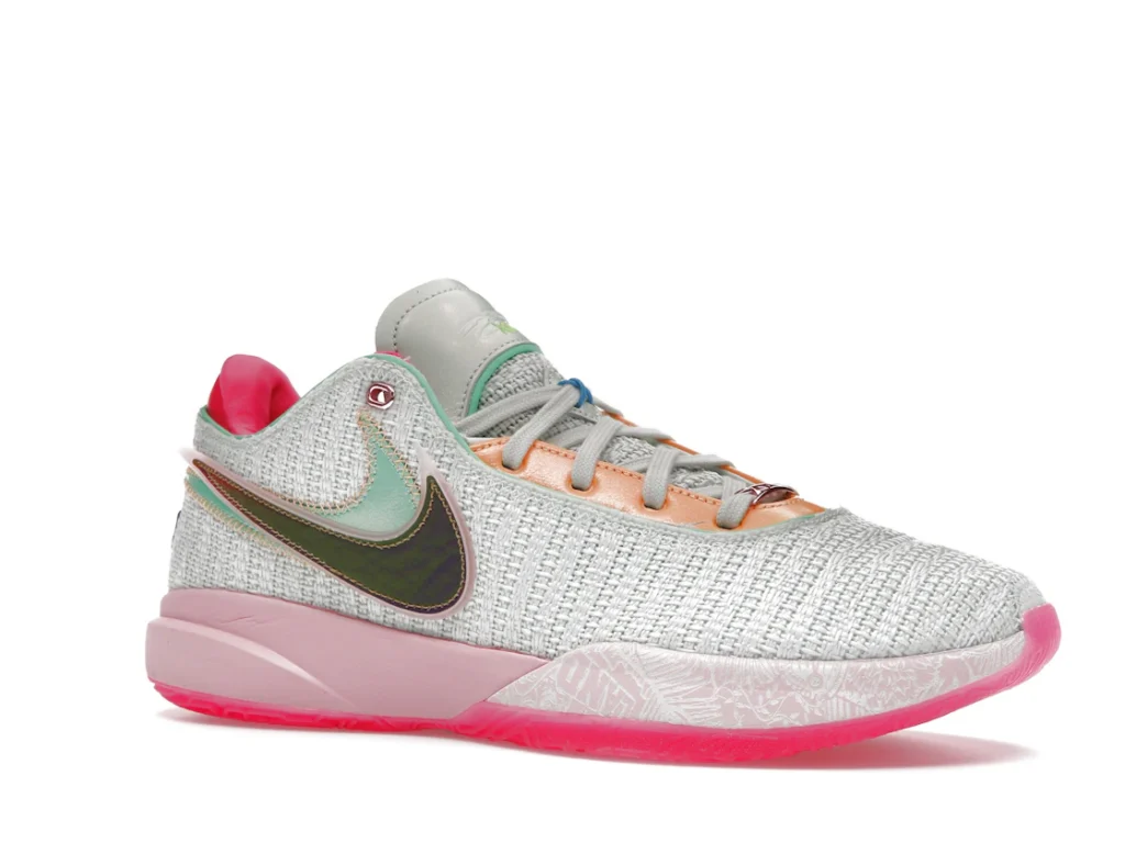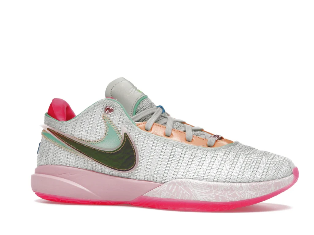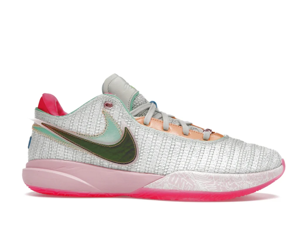 The Nike Lebron 20 Time Machine is a multi-toned sneaker that features medium soft pink and barely green hues as the dominant color schemes.