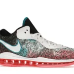 The Nike LeBron 8 V2 Miami Nights arrives in a white, Solar Red, and Glass Blue color scheme with black speckles throughout its mesh upper. Black leather heels play canvas for LeBron’s signature in red, adding the finishing touches.