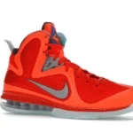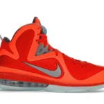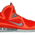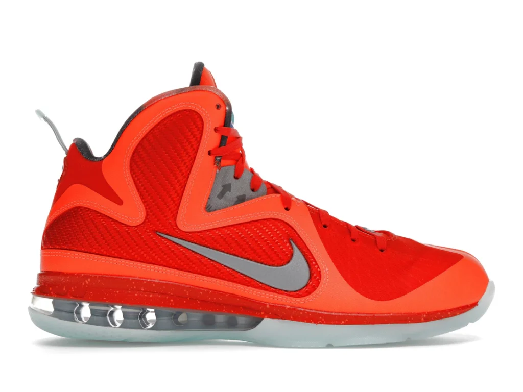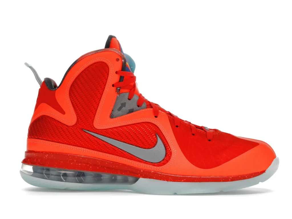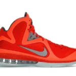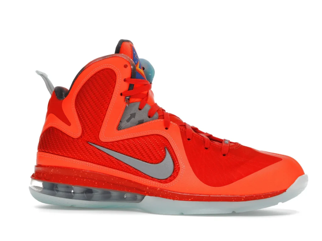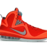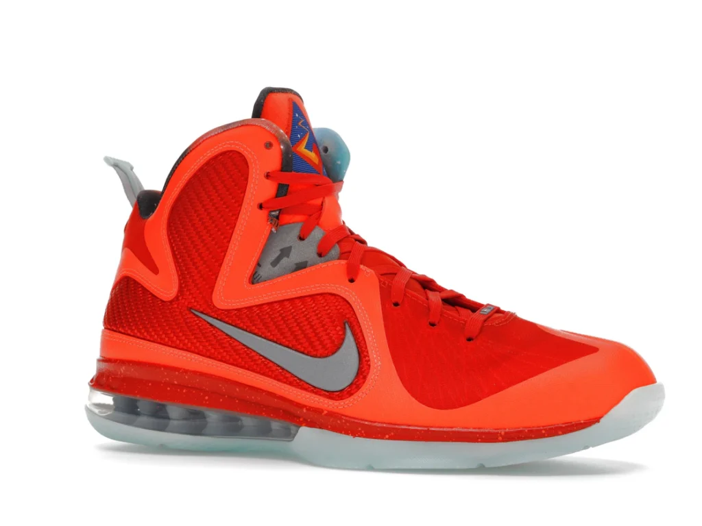 Paying tribute to the Kennedy Space Center in Orlando, which was the host city of the 2012 All-Star Weekend, the Nike LeBron 9 Big Bang embraces an interstellar theme. Its bright orange mesh upper nods to fiery explosions that take place during a space shuttle’s lift off. Metallic silver detailing depicts astronaut suits. Similar to clusters of stars in the solar system, the semi-translucent outsole glows in the dark.